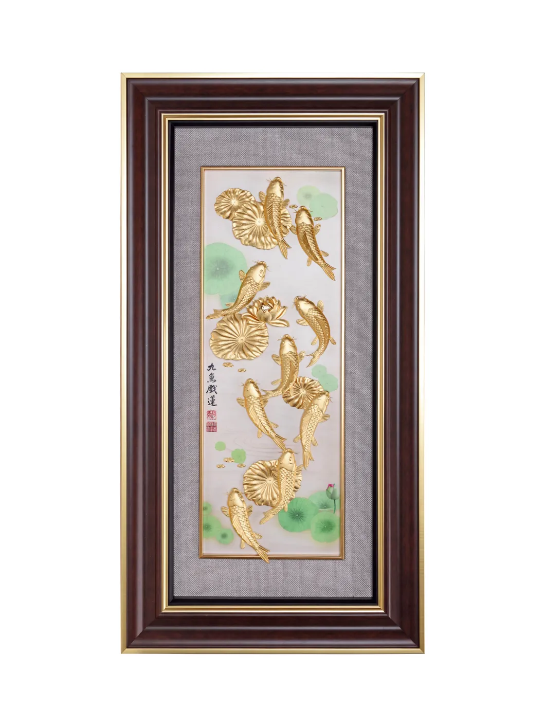 Tranh Cửu ngư quần hội với hình ảnh cá chép và hoa sen, mang ý nghĩa về sự sung túc no đủ đời đời, vương giả thịnh vượng dài lâu. Chất liệu: vàng lá. Bảo quản nơi khô ráo Kích thước: 42 x 81 cm