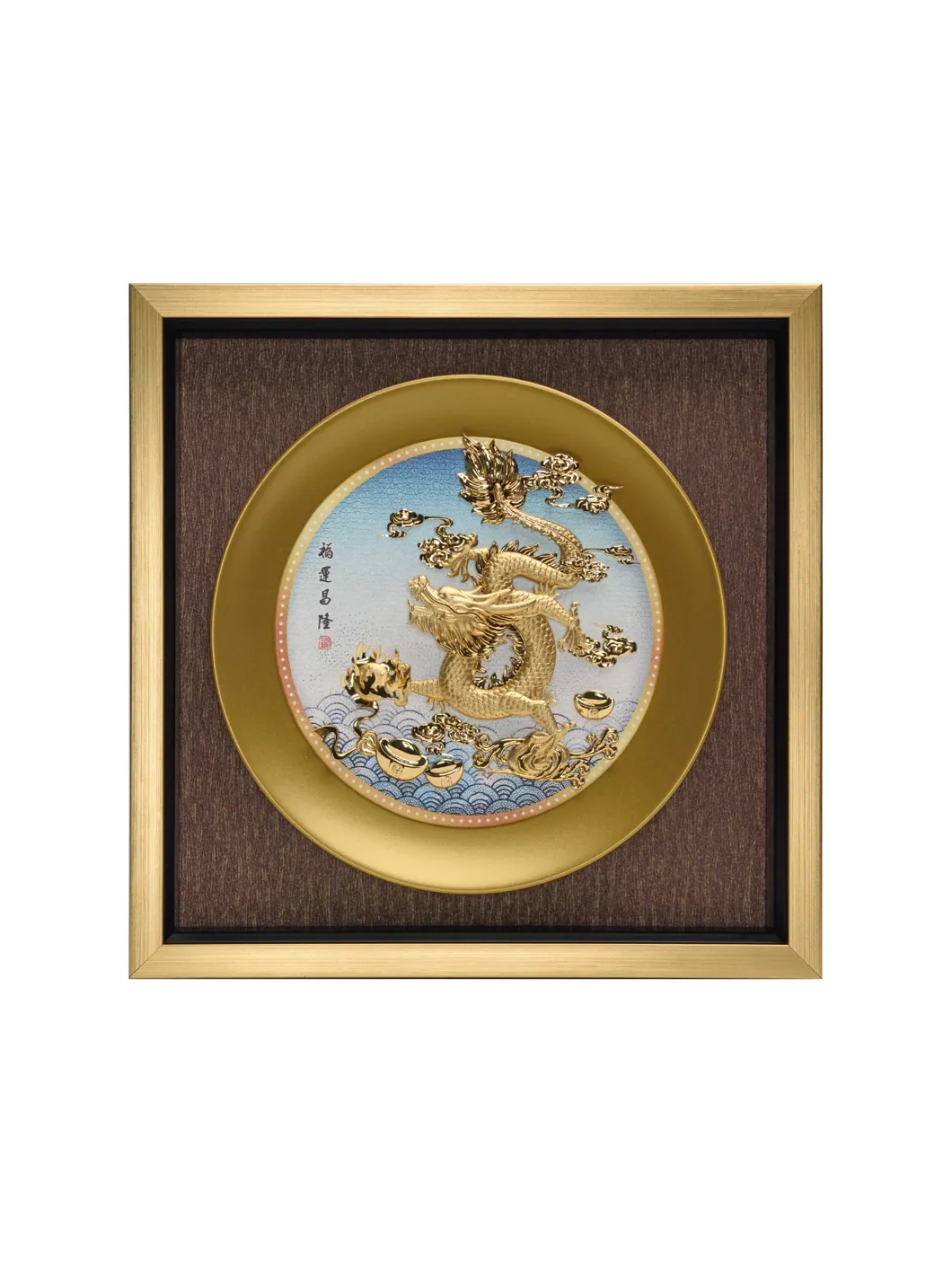 Rồng là biểu tượng cho Quyền lực và Sức mạnh, Sức mạnh thần thánh; nhiệt huyết tinh thần. Rồng là con vật sống được cả dưới nước - trên mặt đất và trên trời. Đây là loài vật linh thiêng, biểu tượng của đế vương và quyền lực tối cao. Chất liệu: vàng lá. Bảo quản nơi khô ráo. Kích thước: 30 x 30 cm