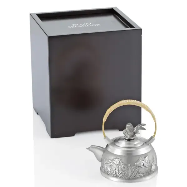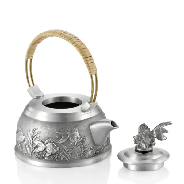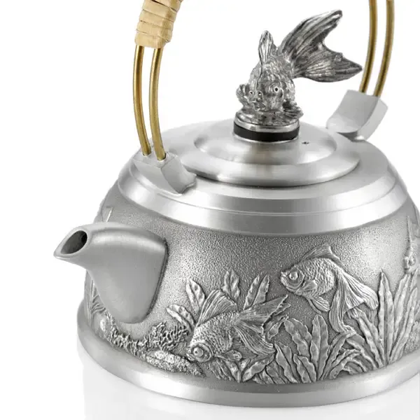 Vĩnh Cửu Thịnh Vượng Trong Từng Tách Trà Bình trà cá vàng 5215 gây ấn tượng với thiết kế tinh xảo: tám chú cá vàng tung tăng bơi lượn quanh thân bình và một chú cá vàng thứ chín được đặt khéo léo trên nắp như một điểm nhấn hoàn mỹ. Lấy cảm hứng từ quan niệm Á Đông, số tám tượng trưng cho sự thịnh vượng và số chín mang ý nghĩa vĩnh cửu, trường tồn, tạo nên thông điệp “Cửu Ngư Quần Hội” – Vĩnh cửu phồn vinh. Ý nghĩa: Về thiết kế: Hình ảnh cá vàng bơi lội không chỉ mang nét duyên thanh nhã mà còn biểu trưng cho tài lộc, hưng thịnh. Về phong thủy: “Cửu Ngư” là biểu tượng may mắn, hanh thông, đặc biệt phù hợp cho không gian thưởng trà hay làm quà tặng ý nghĩa. Chất liệu: Pewter cao cấp không chứa chì, an toàn cho sức khỏe, kết hợp tay cầm bằng đồng bọc mây mộc mạc, tạo cảm giác chắc tay và ấm áp. Kích thước: Cao 10,5cm x Dài 10cm x Đường kính 8,5cm – dung tích 150ml. Hướng dẫn sử dụng: Sử dụng để pha và rót trà, phù hợp cả trà nóng và trà thảo mộc. Vệ sinh bằng tay, tránh dùng chất tẩy mạnh để giữ bề mặt satin của pewter luôn sáng bóng. Sự lựa chọn hoàn hảo: Bình trà cá vàng 5215 là sự kết hợp hài hòa giữa nghệ thuật chế tác kim loại truyền thống và phong cách thưởng trà tinh tế. Thích hợp làm quà tặng cho đối tác, người thân hoặc dành riêng cho những khoảnh khắc thưởng trà tĩnh tại, an yên.