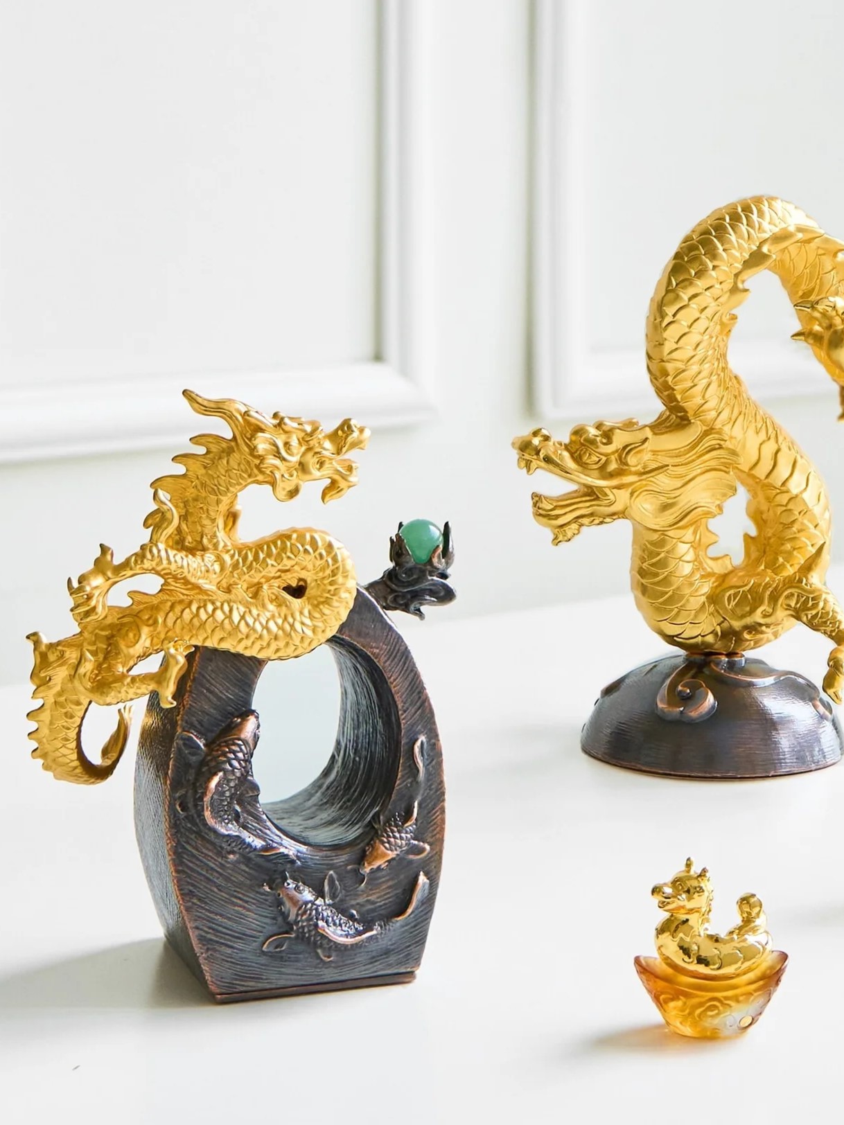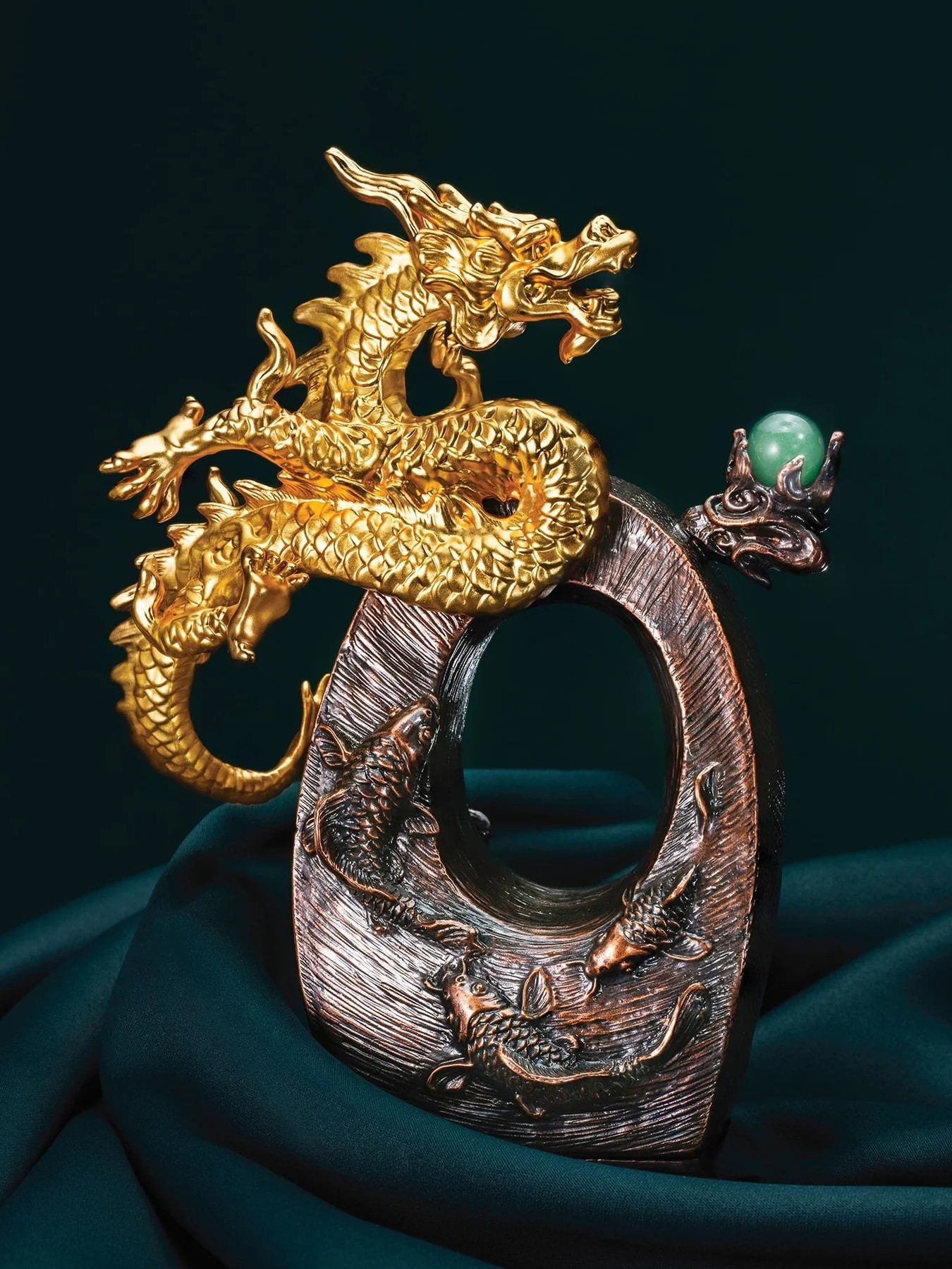 Tượng trưng cho sự chinh phục và thành công vượt bậc, Ấn Rồng Quyền Uy mang trong mình thần thái uy nghi và quyền lực. Lấy cảm hứng từ truyền thuyết "Cá chép hóa rồng" với dòng chữ khắc “鱼跃成龙” (Ngư dược thành long), sản phẩm thể hiện hành trình vượt khó và sự chuyển mình đầy kỳ diệu, từ cá chép bình thường trở thành rồng uy phong. Sáu chú cá chép xoay quanh rồng càng làm nổi bật hành trình chinh phục, tượng trưng cho sức mạnh biến đổi và ý chí bền bỉ trên con đường vươn đến thành công. Ở trung tâm, viên đá Aventurine tỏa sáng lung linh, nhẹ nhàng nằm giữa những ngọn lửa xoáy và được nâng đỡ bởi đám mây cát tường. Tất cả được chế tác tinh xảo, mạ vàng 24K, mang đến vẻ đẹp đẳng cấp và hoàn mỹ. Chất liệu: Pewter mạ vàng Thụy Sĩ 24K trên đế đồng đen, đính đá Aventurine Kích thước: 135mm x 78mm x 175mm Kích thước đá quý: 14mm Trọng lượng: 860g Ấn Rồng Quyền Uy không chỉ là vật phẩm trang trí mà còn là biểu tượng của quyền lực, sự thịnh vượng và thành công trong sự nghiệp. Đây là món quà lý tưởng dành cho những cá nhân thành đạt, phù hợp để trưng bày tại phòng khách, văn phòng hoặc làm món quà cao cấp dành tặng đối tác, bạn bè.