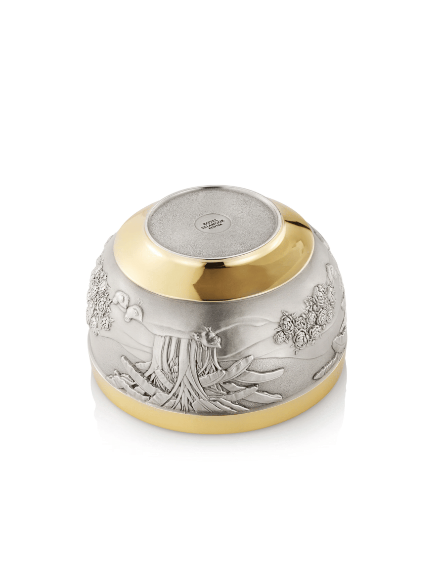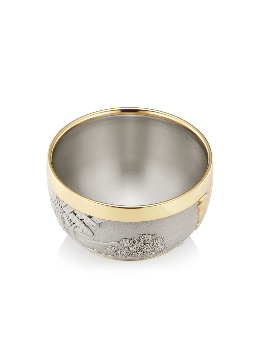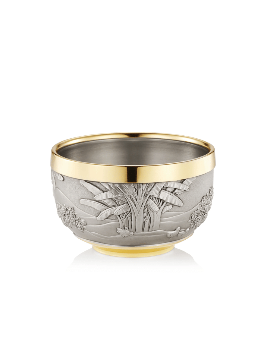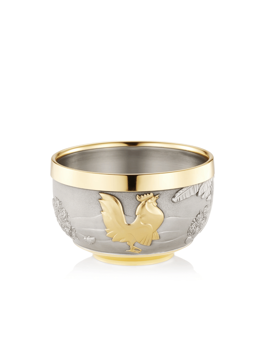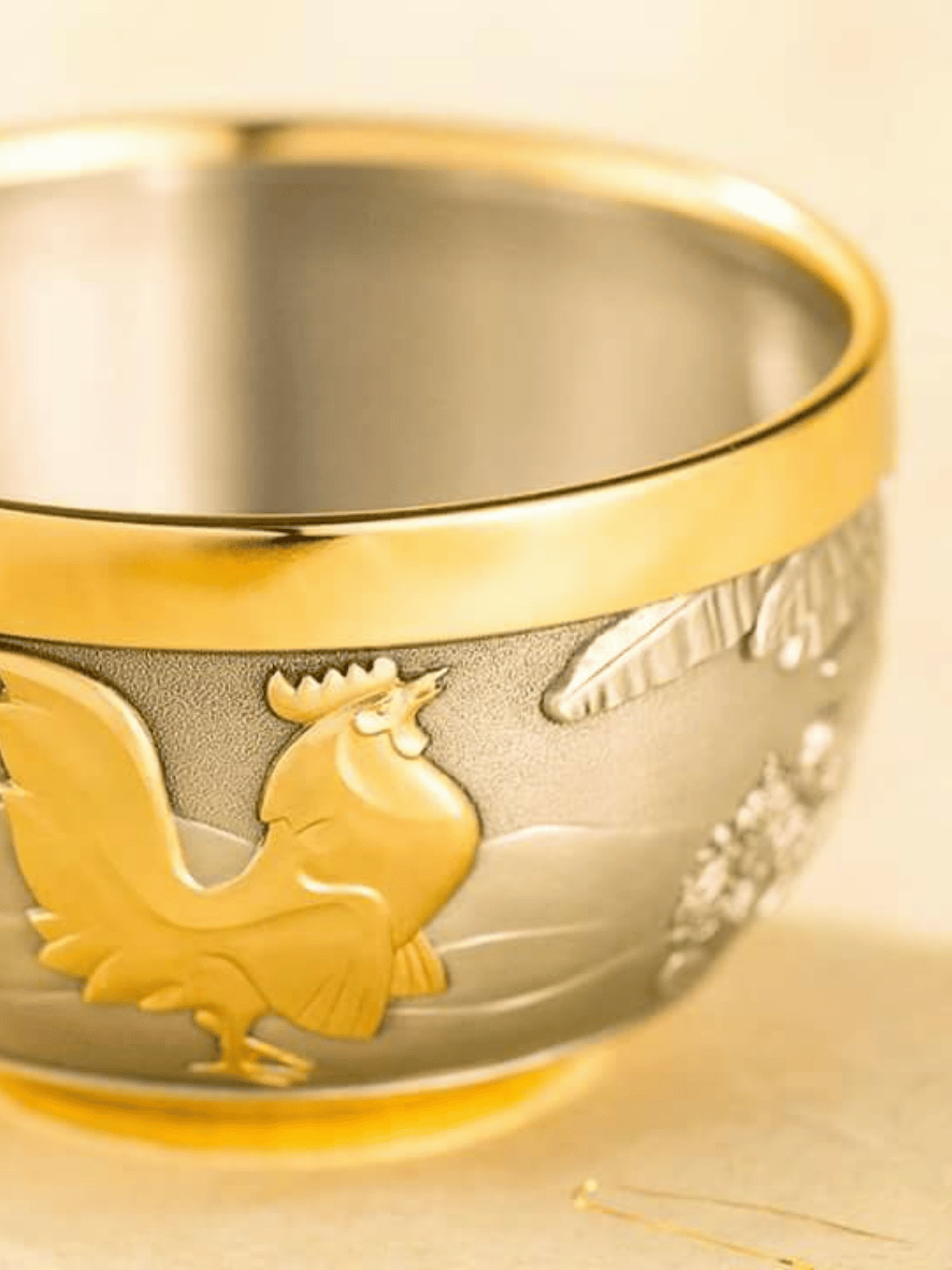 Bát Gà Sung Túc là sự hòa quyện hoàn mỹ giữa nghệ thuật tạo hình tinh xảo và giá trị văn hóa phương Đông sâu sắc. Trung tâm bát nổi bật với hình ảnh gà trống mạ vàng 24K, xung quanh là gà mái và 6 chú gà con quây quần, tạo nên khung cảnh đầm ấm, no đủ. Viền bát và chân bát được mạ vàng, tôn lên vẻ sang trọng, phù hợp để trưng bày trong không gian sống hoặc làm quà tặng cao cấp đầy ý nghĩa. Ý nghĩa: Hình ảnh đàn gà tượng trưng cho sự đoàn viên, sung túc và sinh sôi nảy nở – một lời chúc về tài lộc, phú quý và gia đạo yên vui. Gà trống là biểu tượng của công danh, khí chất nam nhi, trong khi gà mái và gà con thể hiện sự gắn bó và ấm áp của gia đình. Các họa tiết phụ như hoa mẫu đơn (phú quý) và cây chuối (lộc lá) càng làm nổi bật thông điệp may mắn, hưng thịnh dài lâu. Chất liệu: Chế tác từ pewter cao cấp (hợp kim thiếc không chứa chì) – bền đẹp, an toàn tuyệt đối cho sức khỏe. Các chi tiết gà trống, viền bát và chân bát đều được mạ vàng 24K, tạo nên độ tương phản thị giác sang trọng và tinh tế. Kích thước: 10 x 10 x 6 cm Dung tích: 340 g Khối lượng: 320 g Sự lựa chọn hoàn hảo: Bát Gà Sung Túc không chỉ là một tác phẩm trang trí nghệ thuật, mà còn là vật phẩm phong thủy mang lại vượng khí và tài lộc cho gia chủ. Thích hợp để trưng bày trong phòng khách, tủ kính, bàn thờ Thần Tài, hoặc dùng làm quà tặng tân gia, quà biếu sếp, đối tác, người thân trong những dịp đặc biệt như Tết, khai trương hay mừng thọ.