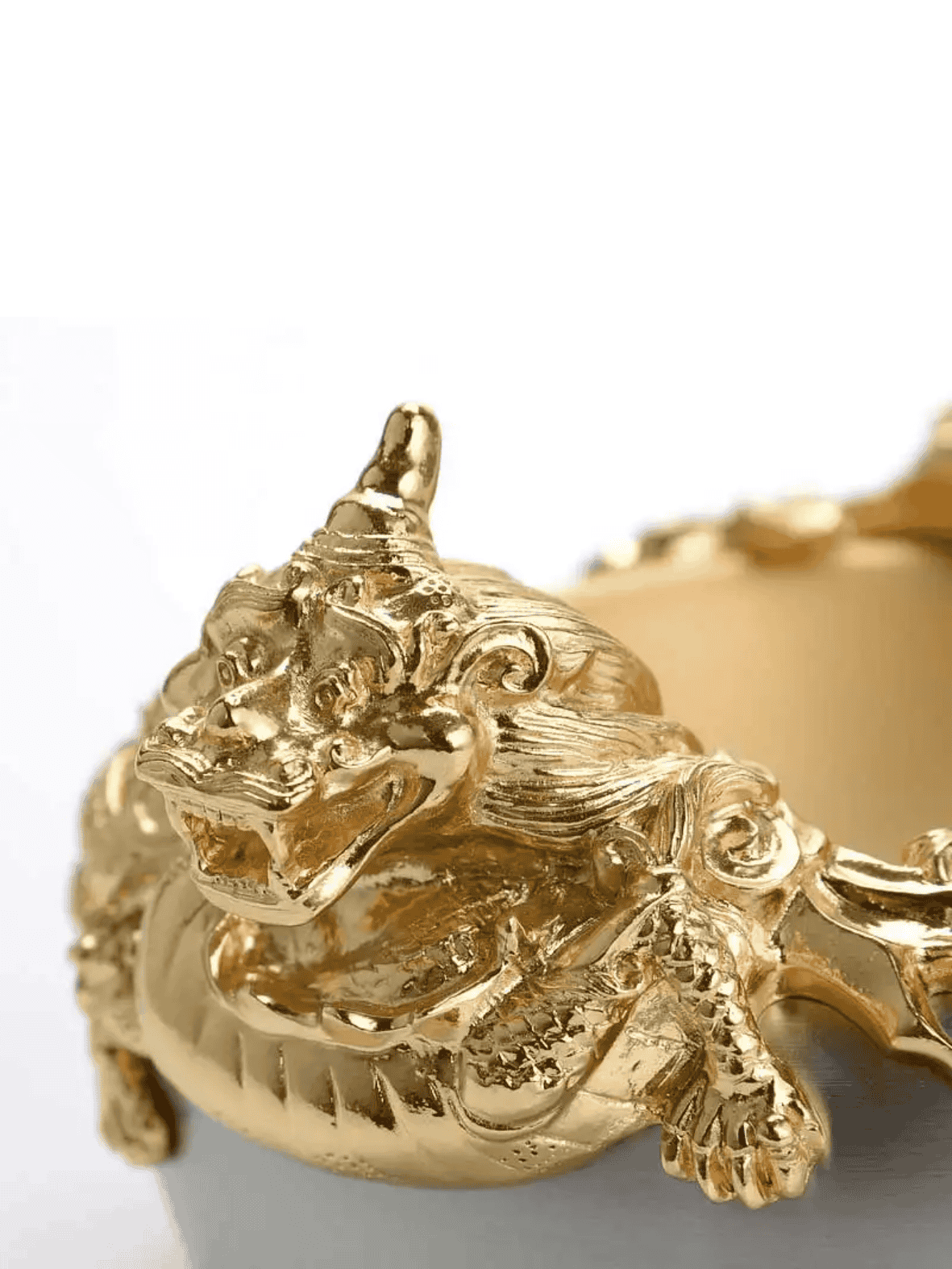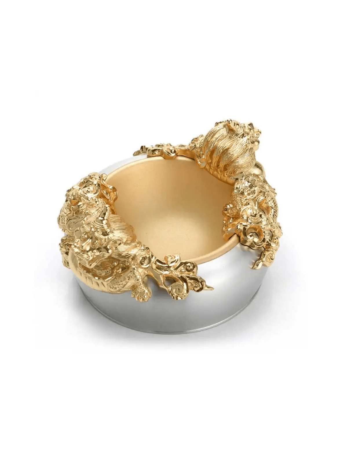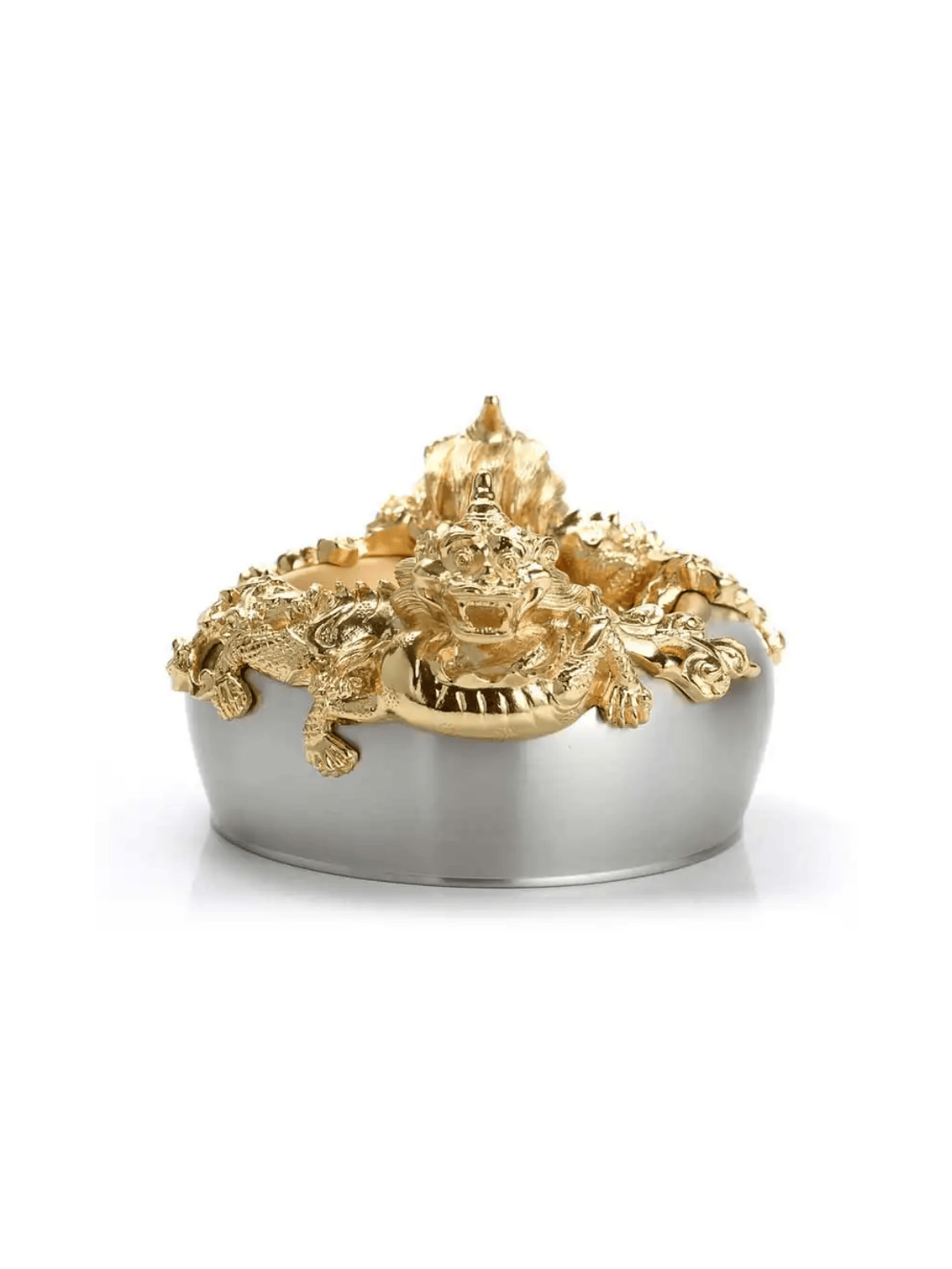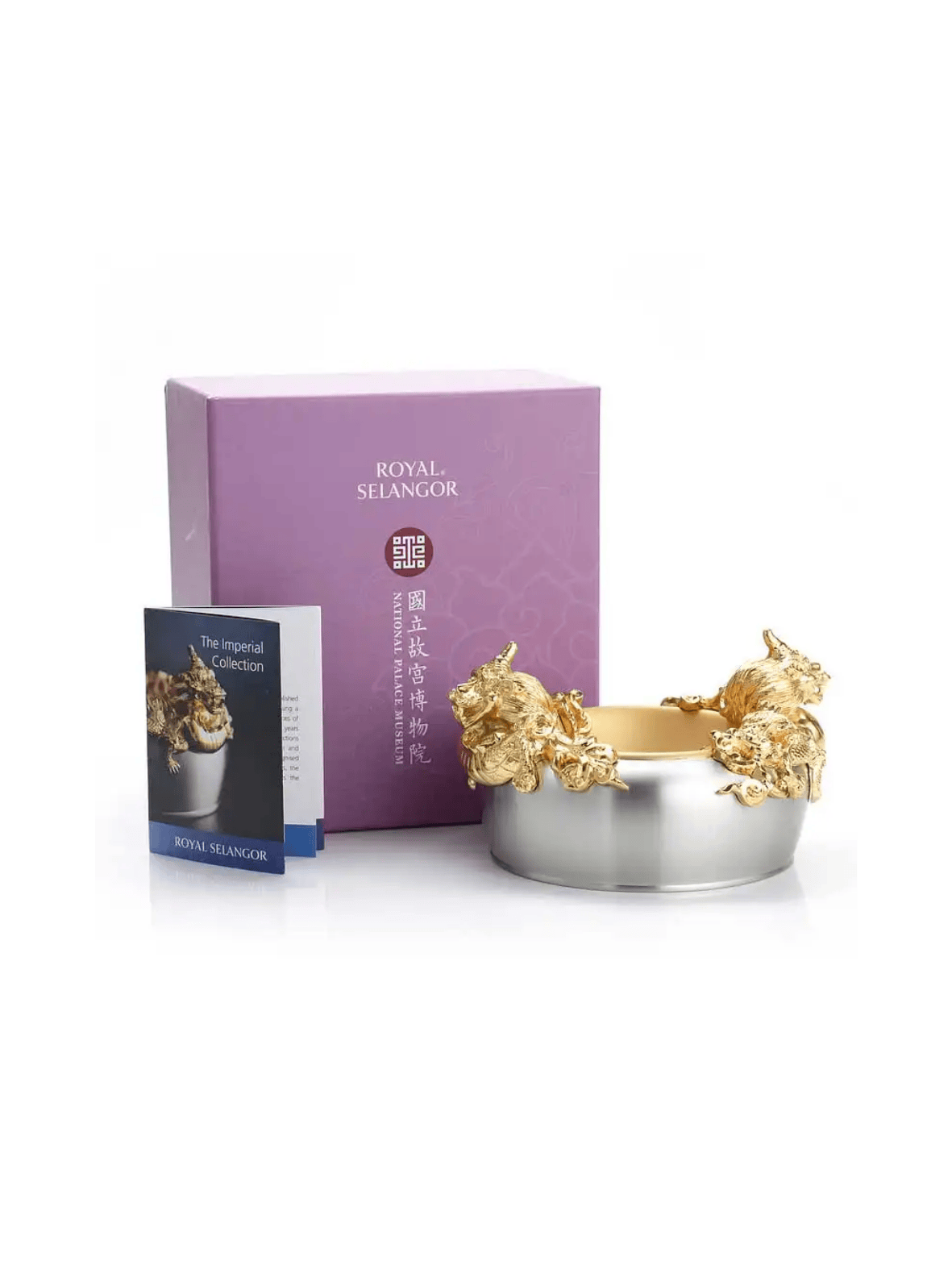 Lấy cảm hứng từ bình gốm tráng men thời nhà Thanh, đặc biệt là những tác phẩm mạ vàng quý hiếm dưới triều vua Ung Chính (1723–1735), Bát Rồng Vàng thuộc bộ sưu tập Đế vương là hiện thân của sự uy quyền, tinh hoa nghệ thuật và vẻ đẹp vượt thời gian. Hai hình tượng rồng kui thời Thanh được chạm khắc tinh xảo, mạ vàng 24K, đặt đối xứng hai bên bát như những linh thú canh giữ tài lộc. Chiếc bát không chỉ là một vật phẩm trang trí đắt giá mà còn mang hơi thở của những hoàng gia xưa, nơi những bát ngọc quý từng tượng trưng cho địa vị và quyền lực tối thượng. Ý nghĩa: Ý nghĩa thiết kế: Hình tượng rồng kui - biểu tượng của sức mạnh và hoàng quyền – được tái hiện sinh động, kết hợp cùng dáng bát tròn đầy tượng trưng cho sự sung túc, viên mãn. Ý nghĩa phong thủy: Trong văn hóa phương Đông, việc trưng bày những chiếc bát quý có khắc hình rồng không chỉ để thu hút tài lộc, mà còn là cách khẳng định sự giàu sang, phú quý của chủ nhân. Ý nghĩa văn hóa: Sản phẩm là một phần trong dự án hợp tác giữa Royal Selangor và Bảo tàng Cung điện Quốc gia Đài Loan, tái hiện những kiệt tác nghệ thuật cổ đại thành vật phẩm ứng dụng cho phong cách sống đương đại. Chất liệu: Pewter cao cấp - kim loại quý không chì, an toàn cho sức khỏe và trường tồn theo thời gian. Rồng mạ vàng 24K – ánh vàng sang trọng, nổi bật mọi không gian bài trí. Kích thước: Cao: 8.5cm Rộng: 16.5cm Đường kính miệng: 14cm Sự lựa chọn hoàn hảo: Bát Rồng Vàng là món quà lý tưởng dành cho những người trân quý vẻ đẹp truyền thống và phong cách sống vương giả. Thích hợp làm quà biếu cao cấp, vật phẩm phong thủy văn phòng, hay điểm nhấn sang trọng trong không gian sống, khơi gợi vượng khí và thịnh vượng bền lâu.