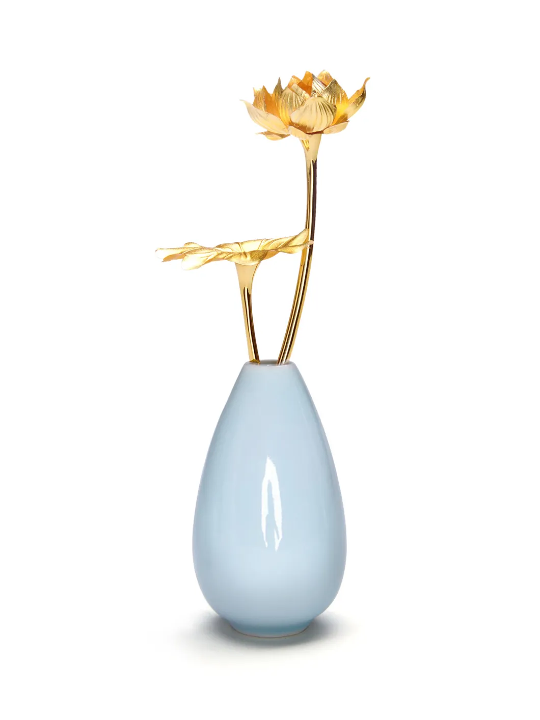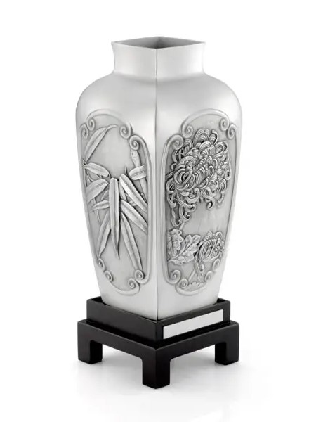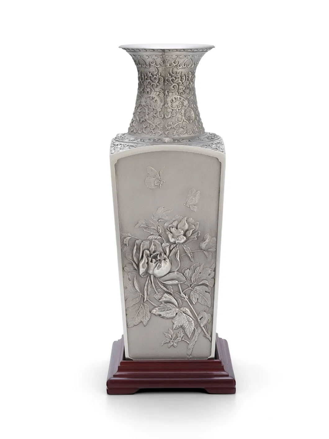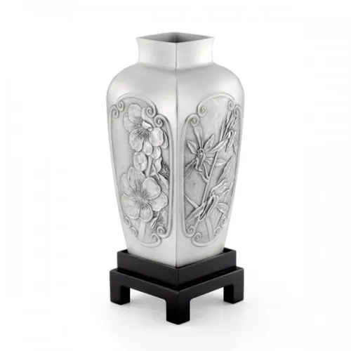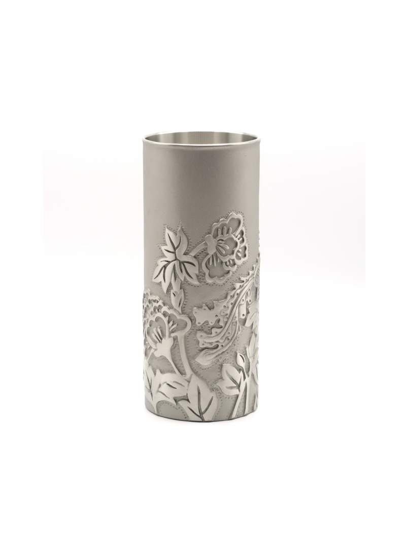 Nằm trong BST Cảm xúc và Ký ức, bình hoa mang tên “Vườn hương” với họa tiết hoa lan châu Phi bao quanh chiếc bình thủy tinh. Phía dưới dây hoa lan là những bông hoa hồng đua nở. Sản phẩm được làm từ thủy tinh và pewter cao cấp
