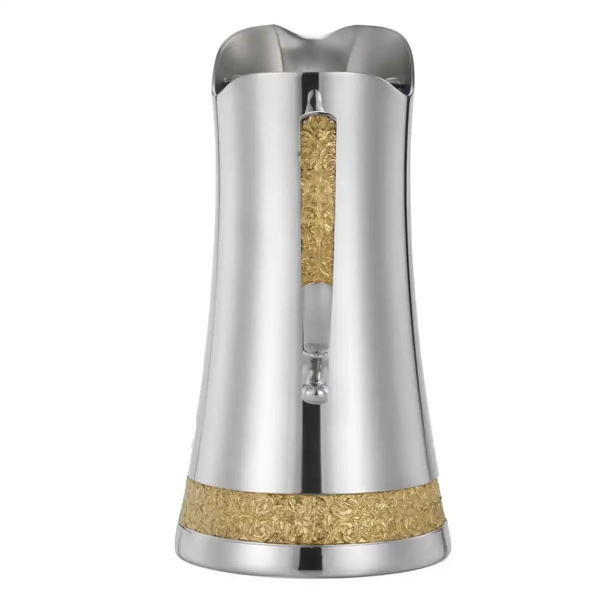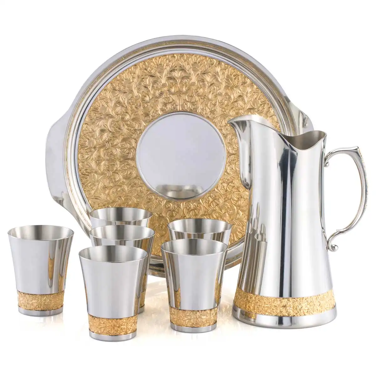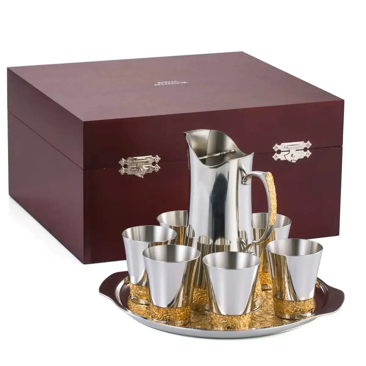 Bộ sản phẩm gồm 1 bình đựng nước, 6 cốc uống nước và 1 khay tròn, được chế tác từ pewter cao cấp không chứa chì, đảm bảo an toàn tuyệt đối cho sức khỏe. Từng chi tiết trên bộ sản phẩm được chạm khắc thủ công với họa tiết cổ điển lấy cảm hứng từ những đường xoáy nghệ thuật trên các tấm gỗ chạm truyền thống ở miền Đông Malaysia – một nét văn hóa đặc sắc được lưu truyền từ thế kỷ 19. Đặc biệt, các họa tiết điểm xuyết được mạ vàng 24K, tạo nên vẻ đẹp rực rỡ và quý phái. Kích thước: Bình: Cao 22.5cm x 16cm x Đường kính 12cm Cốc: Cao 9cm x Đường kính 7.5cm, dung tích 180ml Khay: Đường kính 32.5cm Ý nghĩa: Về thiết kế: Tái hiện vẻ đẹp cổ điển, tinh xảo, mang lại cảm giác trang trọng trong mọi buổi tiệc hay không gian phòng khách. Những đường cong uyển chuyển cùng sắc vàng sang trọng phản chiếu ánh sáng tạo hiệu ứng bắt mắt. Văn hóa và nghệ thuật: Họa tiết gợi nhớ đến vẻ đẹp cung đình Malaysia xưa, thể hiện sự giao thoa giữa mỹ thuật và văn hóa truyền thống. Biểu tượng quà tặng: Thể hiện sự trân trọng và tinh tế, là món quà cao cấp dành cho những dịp đặc biệt như kỷ niệm, tân gia, cưới hỏi hoặc tri ân đối tác, khách hàng quan trọng. Chất liệu: Pewter cao cấp, không chứa chì – an toàn cho người dùng. Họa tiết mạ vàng 24K, tạo điểm nhấn sang trọng và tinh tế. Sự lựa chọn hoàn hảo: Bộ bình và cốc uống nước họa tiết cổ điển không chỉ là một bộ đồ dùng tiện ích mà còn là tác phẩm nghệ thuật trưng bày đẳng cấp. Dù được dùng trong không gian sống hay tặng cho người đặc biệt, bộ sản phẩm đều thể hiện gu thẩm mỹ tinh tế và đậm chất hoàng gia.