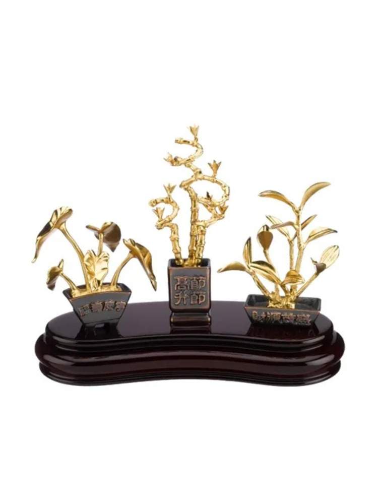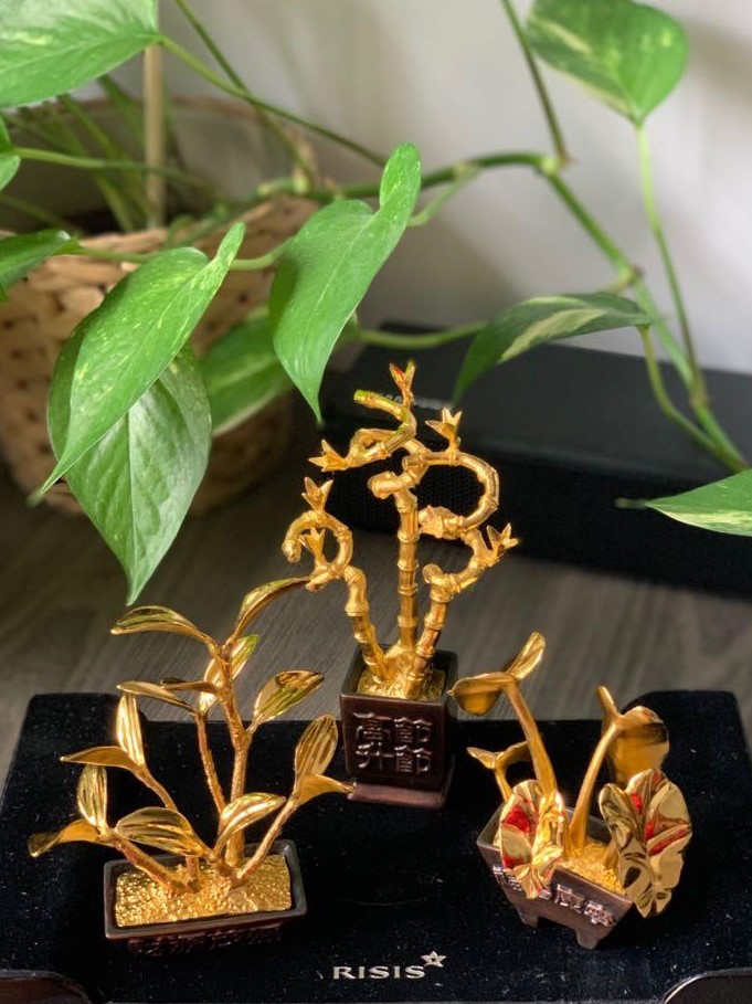 Bộ Cây Phúc - Lộc - Thọ của RISIS bao gồm ba loại cây biểu tượng: - Cây Kim Phát Tài: Đại diện cho "Lộc," biểu trưng cho tài lộc và sự thịnh vượng. - Cây Tre: Đại diện cho "Phúc," mang ý nghĩa sinh trưởng mạnh mẽ và cuộc sống sung túc. - Cây Vạn Niên Thanh: Đại diện cho "Thọ," thể hiện sự trường thọ và sức khỏe dồi dào. Mỗi cây được mạ vàng 24K, đặt trong chậu đồng cao cấp và gắn trên đế gỗ, tạo nên một tổng thể sang trọng và tinh tế, phù hợp để trang trí hoặc làm quà tặng ý nghĩa. Ý nghĩa: Phúc - Lộc - Thọ: Tượng trưng cho ba điều hạnh phúc cơ bản trong cuộc sống: phúc đức, tài lộc và trường thọ. Đây là lời chúc trọn vẹn cho gia đình, bạn bè hoặc đối tác. Phong thủy: Bộ cây giúp thu hút năng lượng tích cực, tài lộc và sự cân bằng, tạo không gian sống và làm việc hài hòa, thuận lợi. Chất liệu: Cây: Mạ vàng 24K, với từng chi tiết được chế tác thủ công tinh xảo. Chậu: Đồng cao cấp, bền bỉ với thời gian. Đế: Gỗ tự nhiên, tăng thêm sự vững chắc và đẳng cấp. Kích thước: Phù hợp đặt ở bàn làm việc, kệ trưng bày hoặc không gian phòng khách, văn phòng. Sự lựa chọn hoàn hảo: Trang trí: Bộ cây Phúc - Lộc - Thọ là điểm nhấn độc đáo và ý nghĩa cho không gian sống hoặc làm việc. Quà tặng: Đây là món quà cao cấp và trang trọng, phù hợp cho các dịp như khai trương, tân gia, kỷ niệm hay chúc mừng. Bộ Cây Phúc - Lộc - Thọ của RISIS không chỉ mang vẻ đẹp thẩm mỹ mà còn chứa đựng giá trị phong thủy sâu sắc, là món quà trọn vẹn cả về ý nghĩa lẫn tinh thần.