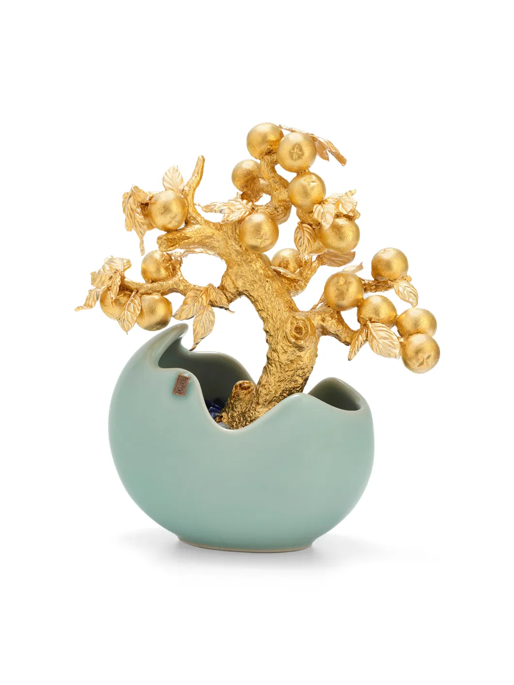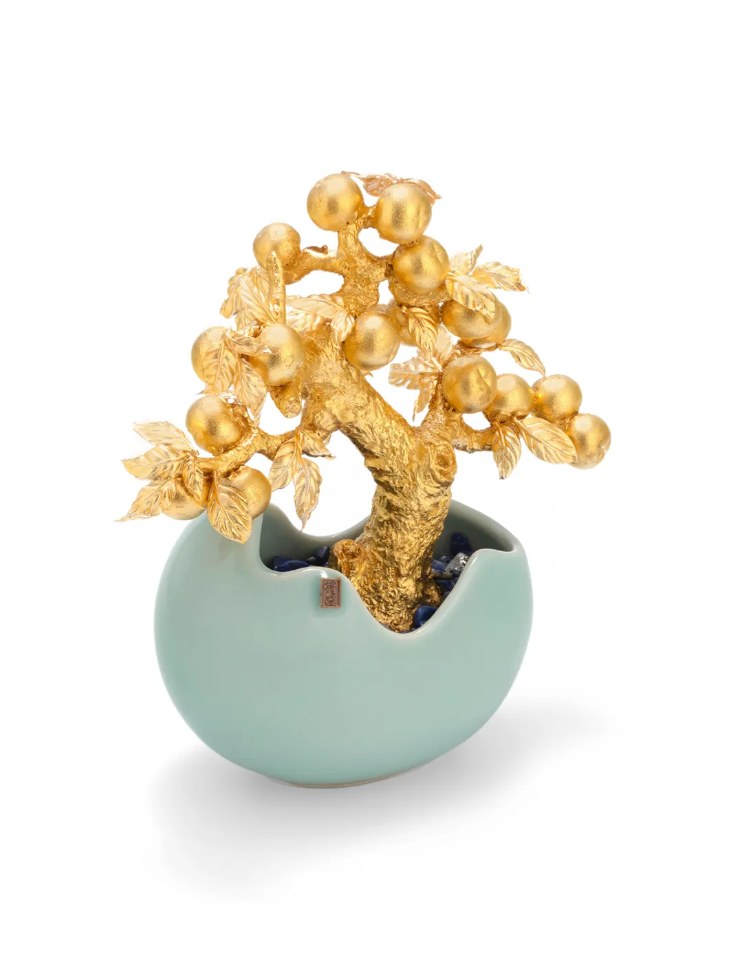 Cây Hồng mang ý nghĩa hồng hào, tươi tốt, tượng trưng cho sự thành đạt, vạn phúc, đa lộc, con đàn cháu đống Chất liệu: vàng lá. Bảo quản nơi khô ráo. Kích thước: 15x10x18 cm