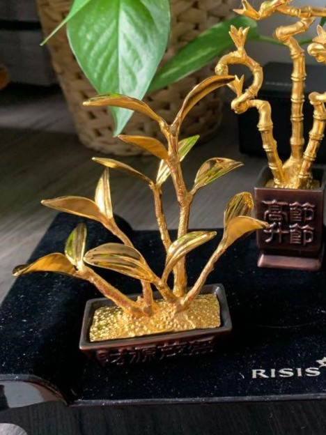 Chậu cây Lộc được tạo hình từ cây Kim Phát Tài – biểu tượng mạnh mẽ của tài lộc và sự thịnh vượng. Sản phẩm được mạ vàng 24K và đặt trong chậu đồng cao cấp, mang đến vẻ đẹp sang trọng và đẳng cấp, phù hợp để trang trí hoặc làm quà tặng. Ý nghĩa: Tài lộc: Cây Kim Phát Tài được biết đến như một biểu tượng phong thủy thu hút tài lộc, thịnh vượng và may mắn, đặc biệt trong môi trường kinh doanh hoặc gia đình. Giúp cân bằng năng lượng, mang lại sự hài hòa và thuận lợi cho không gian sống và làm việc. Chất liệu: Cây mạ vàng 24K, từng chi tiết được chế tác thủ công tinh xảo. Chậu: Đồng cao cấp, tạo sự chắc chắn và bền vững. Kích thước: Phù hợp đặt trên bàn làm việc, kệ trưng bày hoặc góc trang trí trong nhà. Sự lựa chọn hoàn hảo: Trang trí: Chậu cây Lộc là điểm nhấn thanh lịch, làm nổi bật không gian sống và làm việc. Quà tặng: Đây là món quà ý nghĩa và trang trọng dành cho các dịp đặc biệt như khai trương, tân gia, hoặc chúc mừng đối tác, bạn bè, người thân. Chậu Cây Lộc không chỉ là sản phẩm trang trí tinh tế mà còn là biểu tượng phong thủy, mang lại tài lộc và may mắn, phù hợp với mọi không gian và dịp lễ trọng đại.