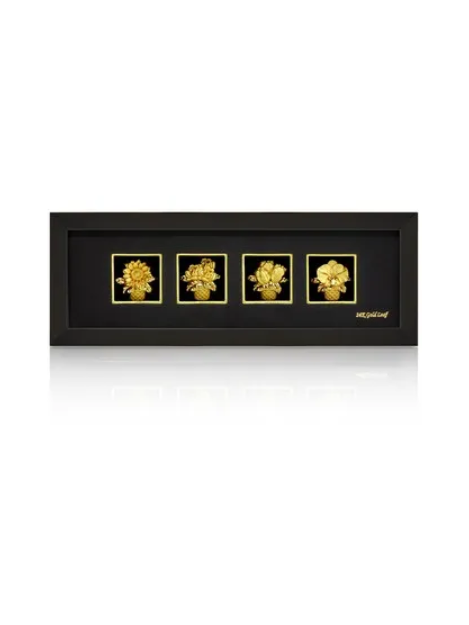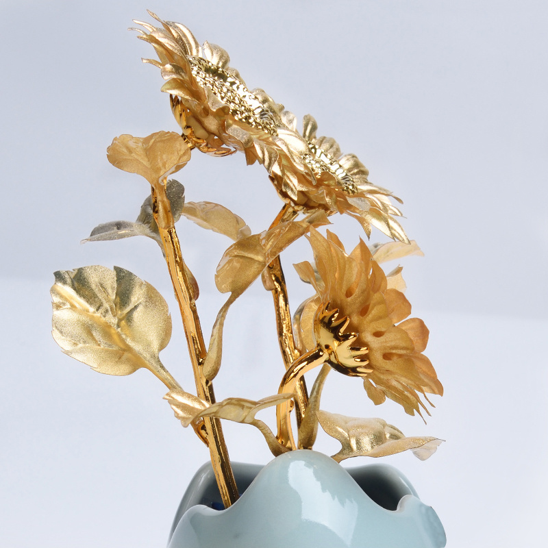 Chậu hoa hướng dương dát vàng 24K là tác phẩm nghệ thuật tinh tế, kết hợp giữa vẻ đẹp tự nhiên của hoa hướng dương và sự sang trọng của vàng lá. Thiết kế độc đáo này mang lại sức sống, sự ấm áp, và vẻ rực rỡ cho mọi không gian sống, đồng thời là món quà ý nghĩa cho những dịp đặc biệt. Ý nghĩa: Biểu tượng của sự trung thành: Hoa hướng dương luôn hướng về phía mặt trời, thể hiện lòng trung thành, sự chung thủy sâu sắc. Sức sống mãnh liệt: Hoa hướng dương đại diện cho sức mạnh, ý chí kiên định và sự tỏa sáng rực rỡ trong cuộc sống. Phong thủy: Mang đến nguồn năng lượng tích cực, tạo không khí ấm áp và thúc đẩy sự thịnh vượng. Chất liệu: Hoa hướng dương được dát vàng 24K cao cấp, nổi bật với độ bóng sáng và sắc vàng quý phái. Chậu gốm sứ trắng tinh khôi, hoàn thiện từng chi tiết, tạo sự hài hòa và đẳng cấp. Kích thước: L: 14 cm, W: 10 cm, H: 18 cm Đặc điểm nổi bật: Chất liệu vàng lá 24K kết hợp với nghệ thuật gốm sứ mang lại sự sang trọng vượt thời gian. Đóng gói trong hộp quà cao cấp, đảm bảo sản phẩm an toàn và sẵn sàng trao tặng. Thiết kế tinh tế phù hợp với mọi phong cách trang trí nội thất. Sự lựa chọn hoàn hảo: Trang trí nội thất: Tạo điểm nhấn ấm áp, tràn đầy năng lượng cho phòng khách, phòng làm việc hoặc không gian gia đình. Quà tặng ý nghĩa: Phù hợp làm quà tặng kỷ niệm, sinh nhật, hay quà tặng tân gia, gửi gắm lời chúc sức khỏe, thịnh vượng và may mắn. Phong thủy: Tăng cường năng lượng tích cực, mang lại sự phồn vinh và sức sống cho gia chủ.