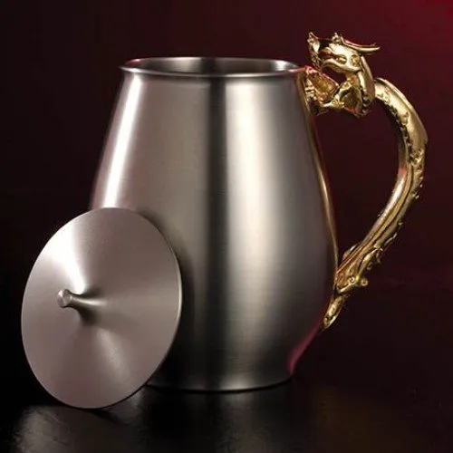 Cốc rồng có nắp, quai được thiết kế đặc biệt với hình ảnh rồng vàng cách điệu. Cốc rồng sẽ là món quà đặc biệt dành tặng những người ruổi Thìn hoặc những người có quyền uy bởi Rồng là biểu tượng cho sức mạnh, uy quyền và sự thịnh vượng. Sản phẩm được làm từ pewter cao cấp, không chưa chì, đảm bảo an toàn cho người sử dụng. Quai rồng cách điệu được mạ vàng 24K.