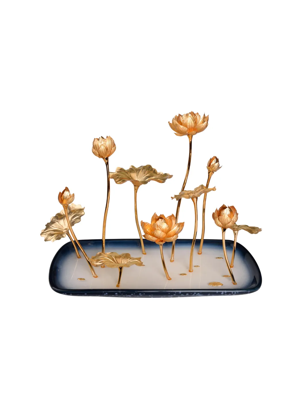 Hoa sen là biểu tượng của sự hoàn hảo, thuần khiết, tượng trưng cho bản chất nguyên thủy của trái tim Chất liệu: vàng lá. Bảo quản nơi khô ráo Kích thước : 15*33*26cm