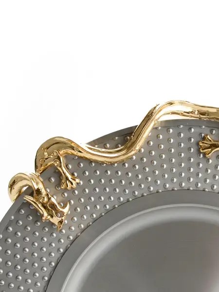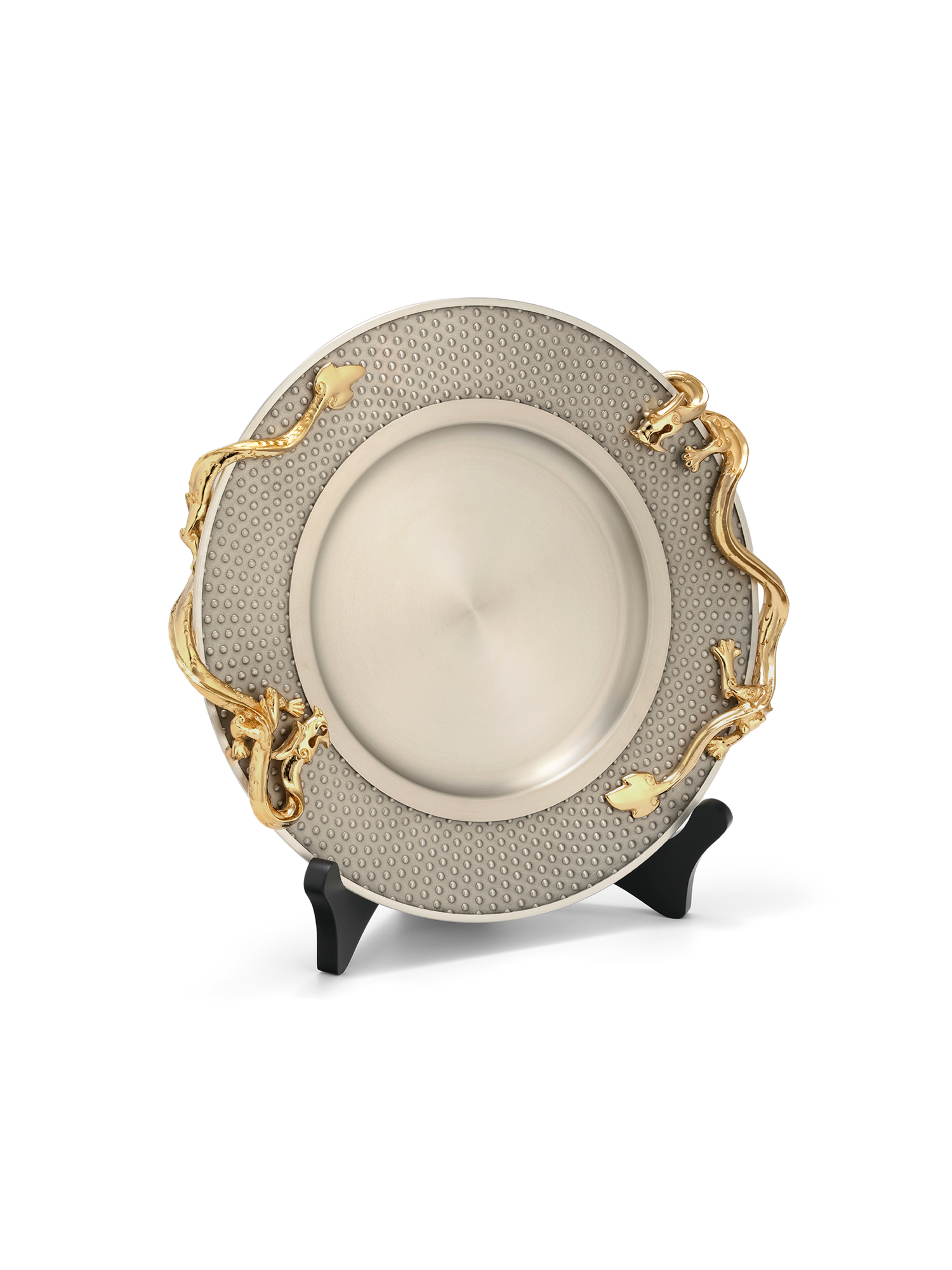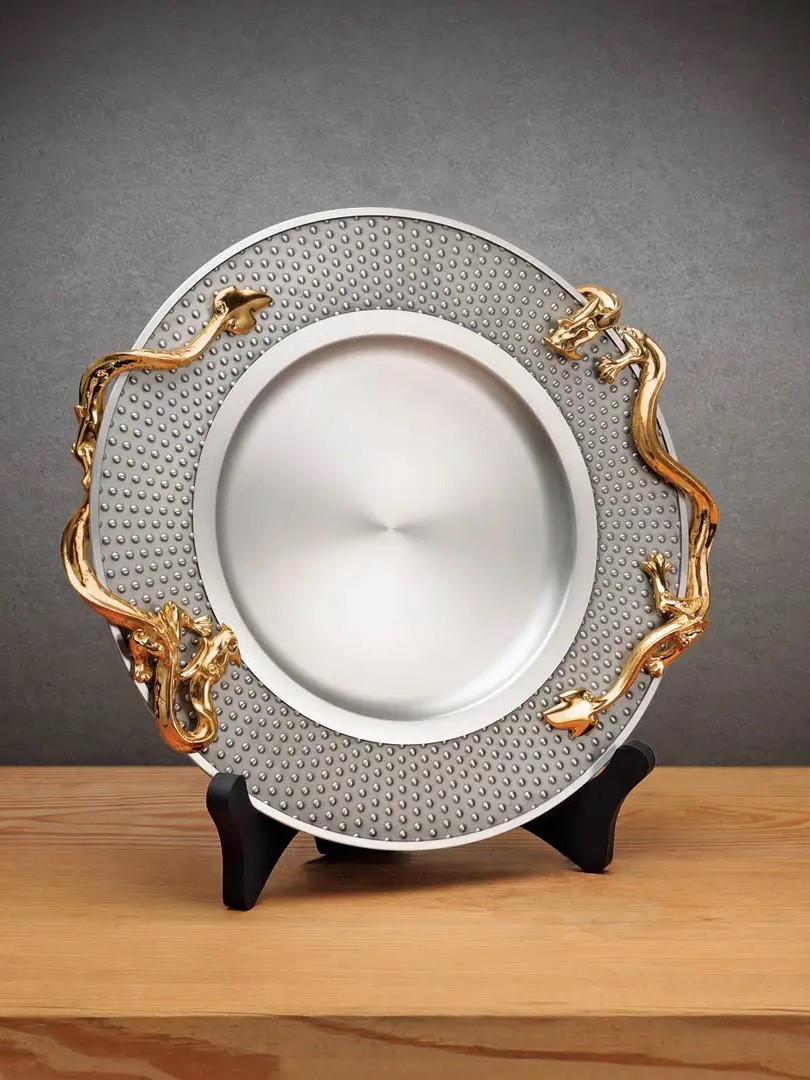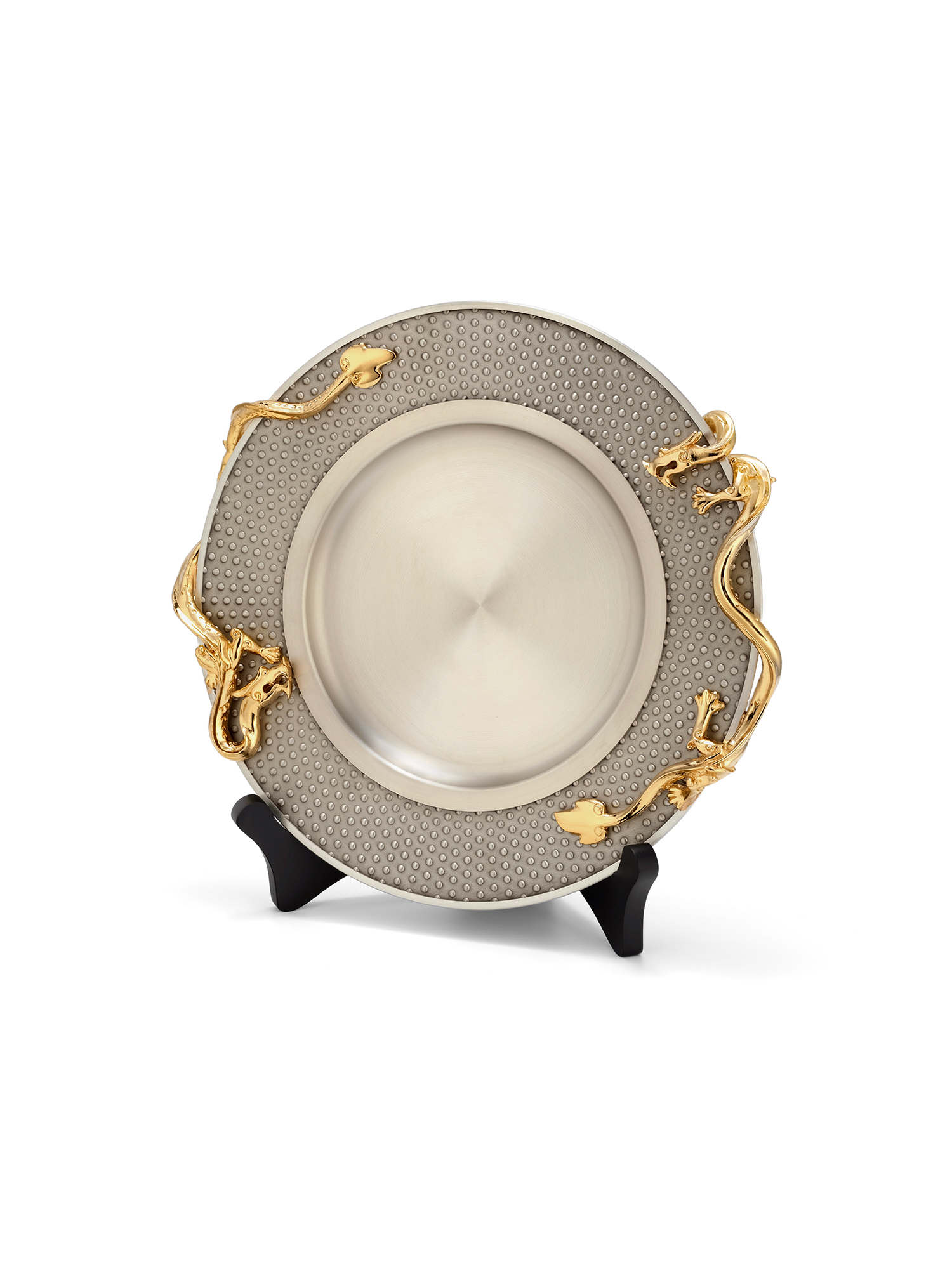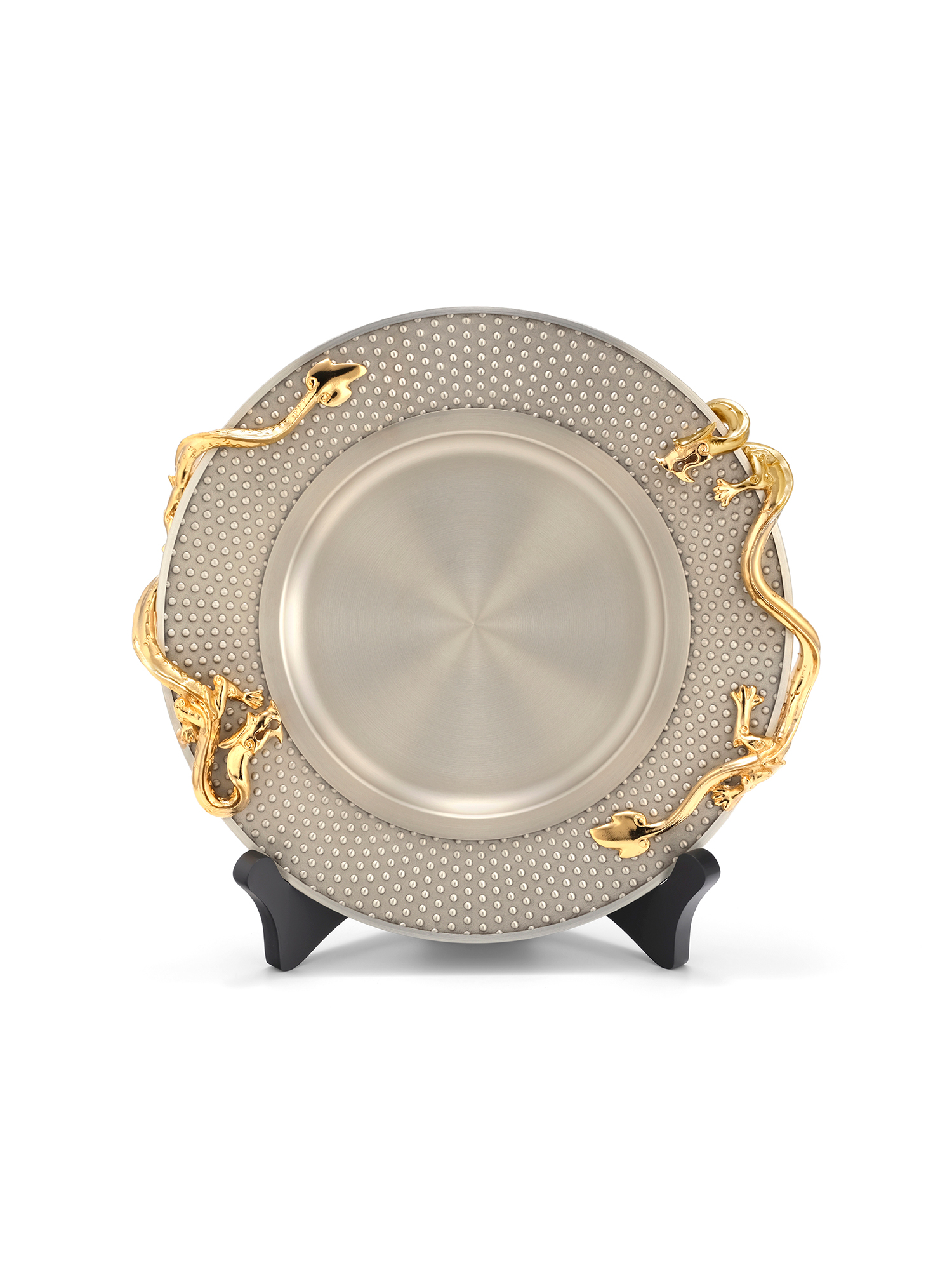 Đĩa Rồng Vàng là tác phẩm nghệ thuật được chế tác tinh xảo từ chất liệu pewter cao cấp – hợp kim truyền thống nổi tiếng với vẻ đẹp bền bỉ và sắc sảo. Trung tâm đĩa nổi bật với họa tiết tròn dạng ngọc bích, mô phỏng các hạt gạo - biểu trưng cho sự sung túc, ấm no. Bao quanh đĩa là hai con rồng quyền uy, uốn lượn mạnh mẽ, thể hiện năng lượng thăng hoa và sức mạnh vượt trội. Mỗi chi tiết rồng đều được mạ vàng 24K, tạo nên vẻ ngoài rực rỡ, cao quý. Ý nghĩa: Về thiết kế: Hình ảnh song long cách điệu, kết hợp giữa yếu tố cổ điển và đường nét hiện đại, mang đến sự hài hòa giữa truyền thống và đương đại. Về chất liệu: Pewter kết hợp mạ vàng 24K không chỉ tăng giá trị thẩm mỹ mà còn tượng trưng cho vượng khí, tài lộc và trường tồn. Phong thủy: Rồng là linh vật đứng đầu trong tứ linh, đại diện cho quyền lực, trí tuệ, thịnh vượng và sự bảo hộ mạnh mẽ. Đặt đĩa Rồng Vàng trong không gian sống hay làm việc giúp tăng cường năng lượng tích cực, mang đến vận may và thành công. Chất liệu: Pewter cao cấp, chi tiết rồng mạ vàng Thụy Sĩ 24K Kích thước: Đường kính 25cm Sự lựa chọn hoàn hảo: Đĩa Rồng Vàng là món quà cao cấp mang giá trị tinh thần và nghệ thuật, phù hợp làm quà tặng đối tác, quà kỷ niệm doanh nghiệp hoặc vật phẩm trưng bày phong thủy trong gia đình, văn phòng. Một biểu tượng sang trọng, đậm chất Á Đông, truyền tải thông điệp về quyền uy và phú quý trọn vẹn.