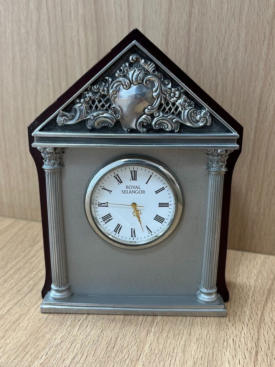 Lấy cảm hứng từ phong cách kiến trúc châu Âu thế kỷ XVII, đồng hồ để bàn Royal Selangor mã 3957 là tác phẩm trang trí đậm chất cổ điển và đầy tính nghệ thuật. Điểm nhấn ấn tượng nằm ở hai thức cột Corinth – biểu tượng kiến trúc của thời kỳ Phục Hưng – với những rãnh chạy dọc thanh lịch, phần đầu cột chạm khắc tinh xảo hình lá ô rô và đường xoắn ốc, gợi nhớ đến những đền đài tráng lệ của châu Âu cổ xưa. Sản phẩm được chế tác thủ công từ hợp kim pewter cao cấp phối hợp cùng gỗ tự nhiên, tạo nên sự kết hợp hài hòa giữa độ bền, vẻ đẹp truyền thống và sự tinh tế hiện đại. Đồng hồ có kích thước lý tưởng để đặt trên bàn làm việc, kệ sách hay trong phòng khách, mang đến điểm nhấn sang trọng và cổ điển cho không gian sống. Ý nghĩa: Ý nghĩa thiết kế: Cảm hứng từ trường phái kiến trúc cổ đại châu Âu, đồng hồ như một tác phẩm nghệ thuật thu nhỏ, thể hiện gu thẩm mỹ đỉnh cao và lòng yêu mến những giá trị lịch sử – văn hóa trường tồn. Ý nghĩa quà tặng: Là món quà tinh tế, sang trọng dành cho các dịp trọng đại như tân gia, kỷ niệm, tri ân hay dành cho những người yêu thích phong cách cổ điển, sưu tầm các vật phẩm nghệ thuật mang giá trị lịch sử. Chất liệu: Pewter nguyên khối cao cấp Gỗ tự nhiên Kích thước: Rộng 110 mm x Sâu 40 mm x Cao 150 mm Sự lựa chọn hoàn hảo: Không chỉ là một công cụ đo đếm thời gian, chiếc đồng hồ để bàn 3957 của Royal Selangor còn là một biểu tượng nghệ thuật mang tính di sản. Một điểm nhấn trang nhã cho không gian sống và làm việc, đồng thời là món quà trang trọng dành cho những ai yêu thích vẻ đẹp hoài cổ và đẳng cấp vượt thời gian.