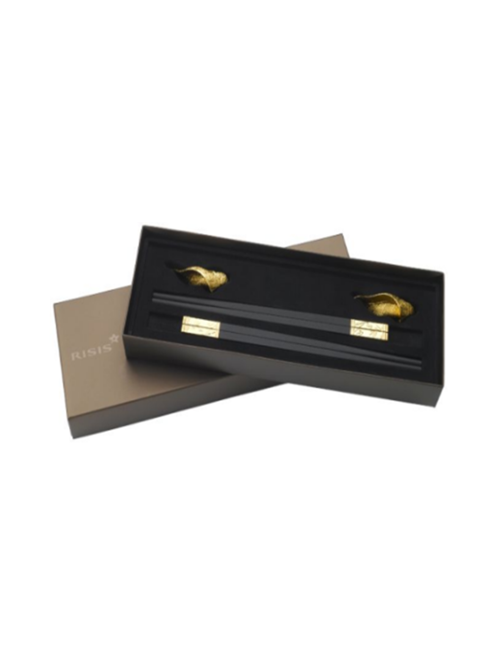 Hai cặp đũa tre trên giá đỡ hình chiếc lá mạ vàng