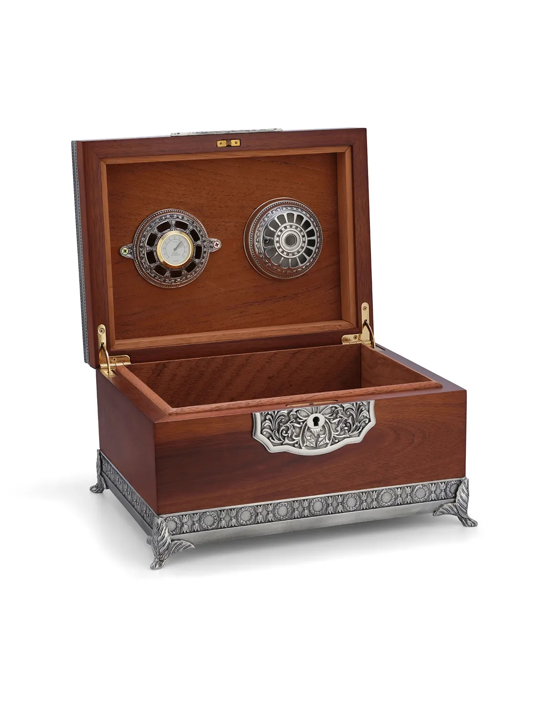 Hộp giữ ẩm - vật dụng không thể thiếu với những người hút xì gà. Hộp giữ ẩm xì gà được thiết kế đặc biệt với lớp gỗ Cedar (Tây Ban Nha) bảo vệ điếu xì gà tránh khỏi mọt xì gà. Bên trong hộp xì gà có ẩm kế giúp đo độ ẩm; thể điều chỉnh độ ẩm cho xì gà một cách thích hợp. Bề mặt hộp xì gà được làm bằng gỗ Sepetir, đánh bóng như bề mặt đàn piano giúp hộp xì gà càng thêm sang trọng