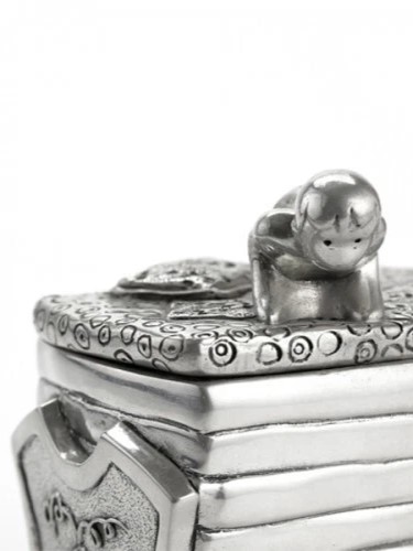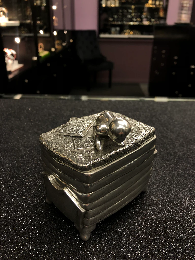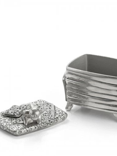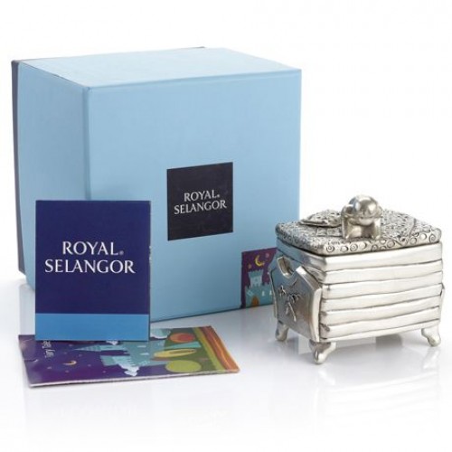 Hộp đựng trang sức "Công chúa hạt đậu" - lấy cảm hứng từ câu chuyện cùng tên, không chỉ được sử dụng làm hộp đựng trang sức hay những vật dụng nhỏ mà còn giúp người lớn kể câu chuyện thú vị hay cùng chơi với con trẻ để đi tìm hạt đậu ẩn sâu dưới lớp đệm dày. Sản phẩm làm bằng chất liệu pewter cao cấp, thể hiện sự sáng tạo của những nhà thiết kế Royal Selangor.