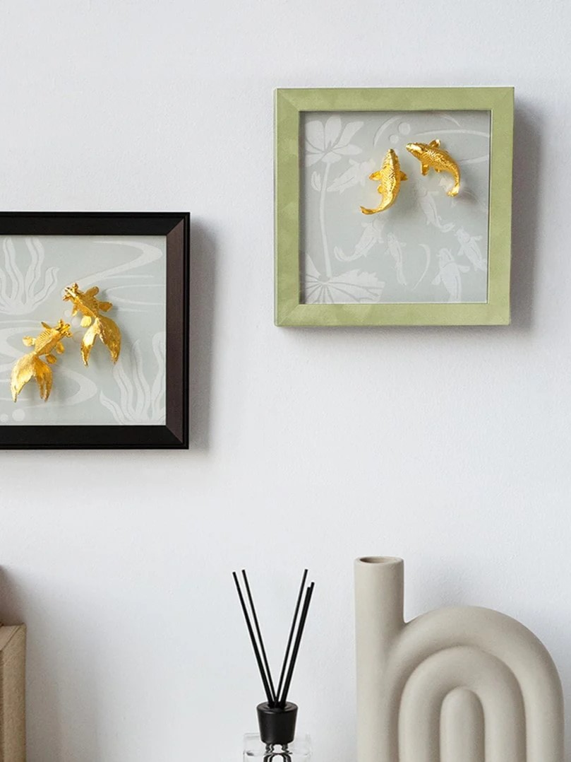 Hai chú cá chép mạ vàng 24k gắn trên nền kính cùng với hoa văn 7 chú cá khác tạo thành bức tranh Cửu ngư gồm 9 chú cá vàng tượng trưng cho thịnh vượng, thành đạt, sắc đẹp, sức khỏe, trí tuệ, sức mạnh, tuổi thọ, vững chắc và lòng nhân ái. Kích thước: 24 x 24 cm