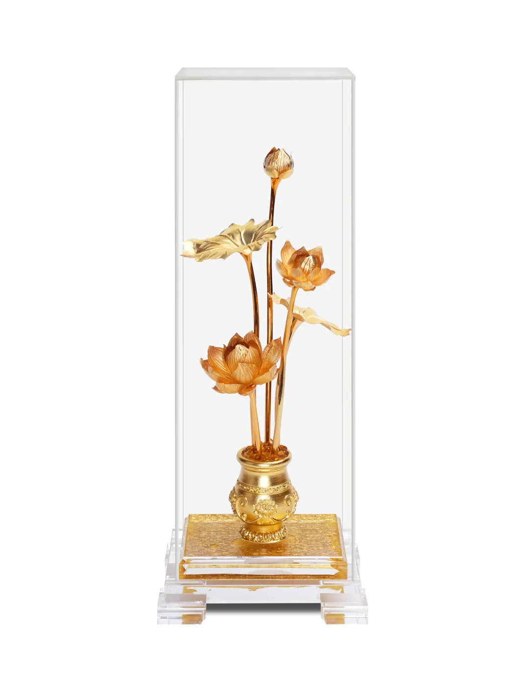 Hoa sen là biểu tượng của sự hoàn hảo, thuần khiết, tượng trưng cho bản chất nguyên thủy của trái tim Chất liệu: vàng lá. Bảo quản nơi khô ráo Kích thước :15.5x13x39cm
