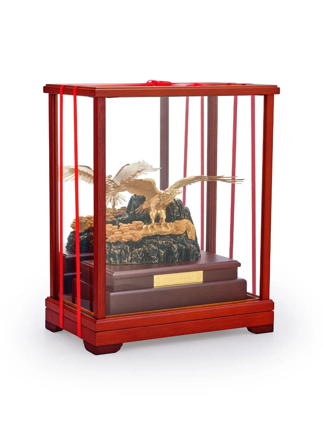 Hình ảnh đại bàng tung cánh, bay lượn trong không trung tạo nguồn sinh khí tốt, thu hút năng lượng và vận may vào cho gia chủ. Móng vuốt sắc nhọn của Đại bàng thể hiện sức mạnh, sự vững chắc, dám đương đầu với khó khăn, thách thức. Chất liệu: vàng lá. Bảo quản nơi khô ráo. Kích thước: 29x17x35 cm