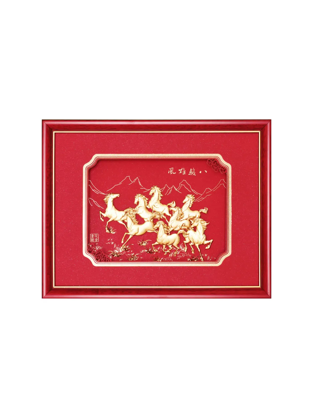 Tranh Bát Mã 25x32 là tác phẩm nghệ thuật đặc sắc, tái hiện hình ảnh tám chú ngựa mạnh mẽ phi nước đại, tượng trưng cho sự thành công và phát triển. Với thiết kế tinh xảo và ý nghĩa phong thủy sâu sắc, bức tranh không chỉ là món đồ trang trí sang trọng mà còn mang đến nguồn năng lượng tích cực cho không gian sống và làm việc. Ý nghĩa: Trong phong thủy, hình ảnh tám con ngựa phi nước đại biểu trưng cho sự bền bỉ, kiên nhẫn và thành công vượt bậc. Bức tranh mang thông điệp chúc tài lộc dồi dào, sự nghiệp thăng tiến và công việc hanh thông. Tám chú ngựa được khắc họa sống động, mạnh mẽ và đầy khí thế, tượng trưng cho sự đoàn kết và tinh thần chiến thắng. Từng chi tiết dát vàng lấp lánh giúp bức tranh tỏa sáng, tạo điểm nhấn sang trọng cho không gian. Vàng lá nguyên chất mang lại giá trị cao cấp và trường tồn, đồng thời thể hiện sự thịnh vượng, giàu có và đẳng cấp của gia chủ. Tranh Bát Mã giúp kích hoạt tài lộc, hỗ trợ công việc kinh doanh phát đạt, thuận lợi. Treo tranh tại nơi làm việc mang lại sự thăng tiến và thành công trong sự nghiệp. Đối với những người hay đi xa, bức tranh là biểu tượng của sự an lành và thuận lợi trong mọi chuyến đi. Chất liệu: Vàng lá nguyên chất, đảm bảo độ bền và giá trị thẩm mỹ cao. Kích thước: 25 x 32 cm Sự lựa chọn hoàn hảo: Tranh Bát Mã 25x32 là món quà sang trọng và ý nghĩa, phù hợp dành tặng đối tác, lãnh đạo, hoặc người thân trong các dịp đặc biệt như khai trương, tân gia, hay kỷ niệm. Bức tranh không chỉ làm đẹp không gian sống mà còn gửi gắm lời chúc thành công, tài lộc dồi dào và may mắn trong mọi hành trình của cuộc sống.