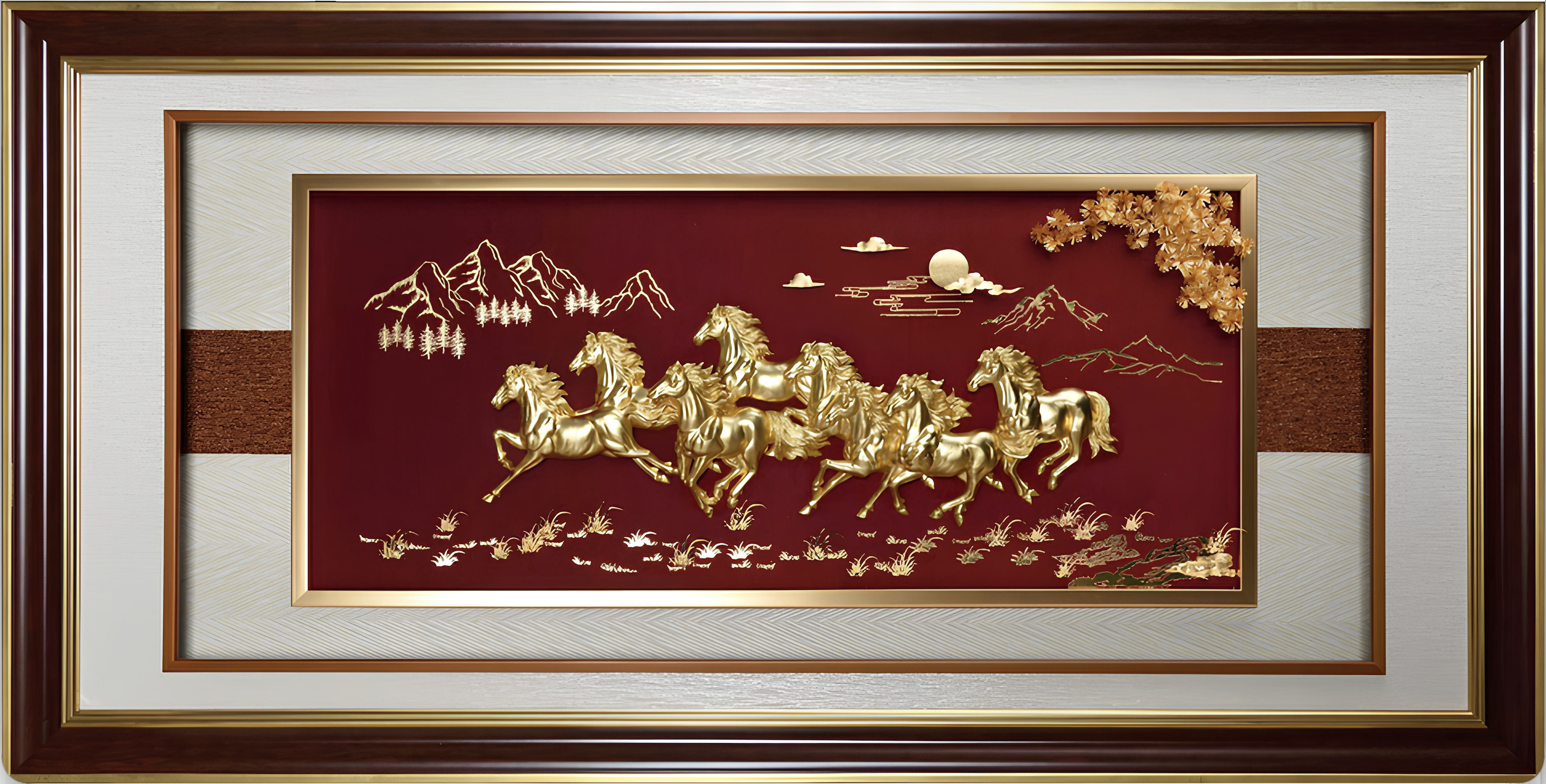 Bức tranh khắc họa đoàn tám chú ngựa tung vó trong làn gió mạnh, biểu trưng cho khí thế dâng trào, tinh thần bứt phá và quyết tâm tiến bước đầy uy lực. Hình ảnh Bát Mã lao về phía trước giữa không gian núi trời khoáng đạt tượng trưng cho đại nghiệp hanh thông, cơ hội rộng mở và vận may liên tục gia tăng. Tác phẩm gửi gắm thông điệp về sự thăng tiến vững chắc và hành trình chinh phục những tầm cao mới. Chất liệu: Vàng lá 24K Kích thước: 66x130cm