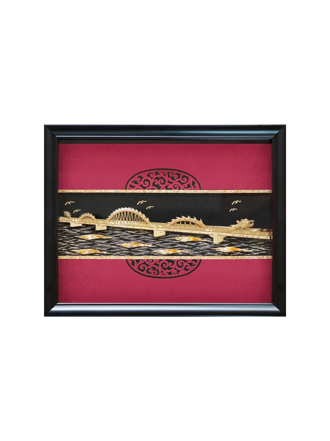 Cầu Rồng thể hiện tầm vóc mới của thành phố Đà Nẵng – thành phố đáng sống nhất Việt Nam, hiện đại, năng động, đang vươn mình ra biển Đông, một biểu tượng sinh động cho sự phát triển vô cùng mạnh mẽ, vững vàng, sẵn sàng hội nhập trong cả khu vực và với cả thế giới. Chất liệu: vàng lá. Bảo quản nơi khô ráo Kích thước: 25x32cm
