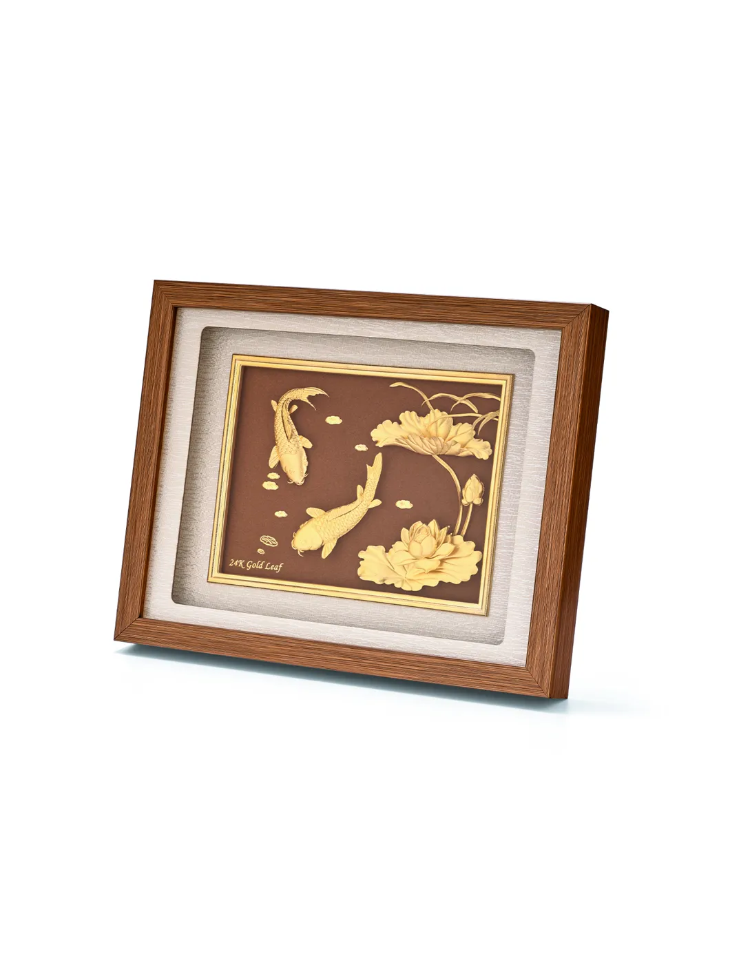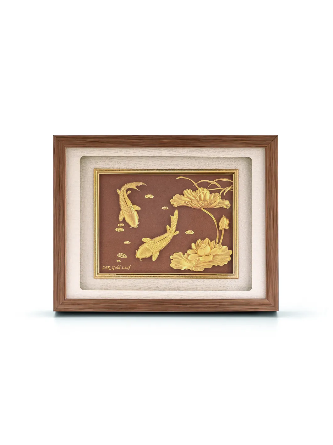 Sen", chữ hán đọc là "liên" đồng âm với "liên" (liên tục, liên tiếp, liền nhau), "cá" chữ Hán đọc là "ngư" đọc là "yu": đồng âm với "dư" (dư dả). Sen - cá biểu ý cho sự "dư dả liên tục" nghĩa là không phải lúc dư lúc thiếu mà luôn luôn dư ăn dư để. Chất liệu: vàng lá. Bảo quản nơi khô ráo Kích thước: 26 x 33 cm