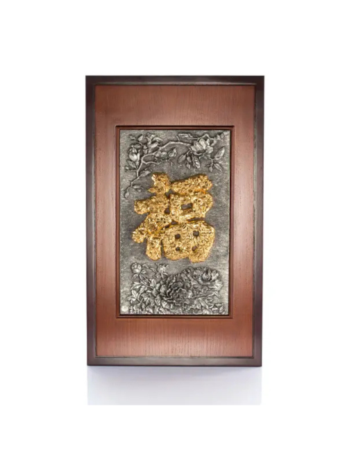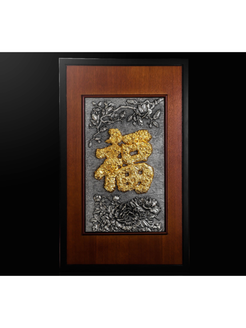Tranh chữ Phúc - với chữ Phúc đặt tại trung tâm của bức tranh, xung quanh là hình ảnh hoa phong lan, hoa mẫu đơn, hoa đào, hoa cúc, cây tre và hoa mận đan xen, sản phẩm là một món quà tuyệt vời mang ý nghĩa An lành - Hạnh phúc dành tặng bạn bè và người thân. Sản phẩm làm từ chất liệu pewter cao cấp, chữ Phúc mạ vàng 24K, khung tranh được làm từ gỗ tự nhiên. Kích thước: Cao 68cm x Rộng 41cm x Dày 2cm. Bao gồm tấm khắc cá nhân hóa 3.5cm x 9cm. Tác phẩm là lựa chọn hoàn hảo để trang trí không gian sống, thể hiện sự tinh tế và gửi gắm thông điệp về may mắn, thịnh vượng và hạnh phúc.