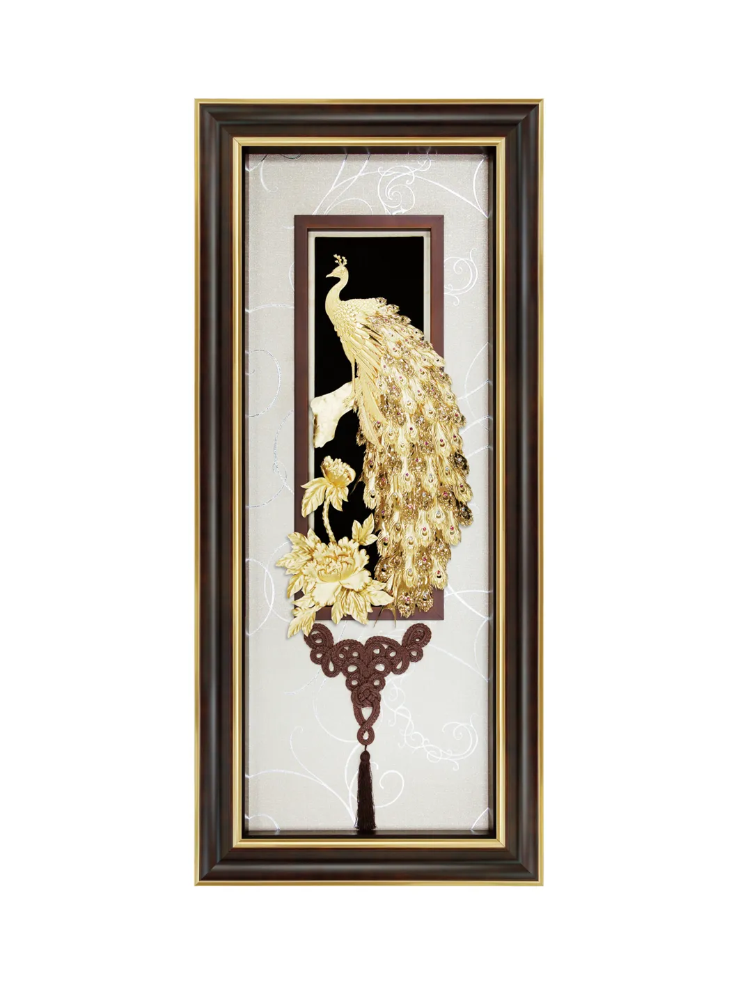 Tranh chim công được coi là biểu tượng cho tiền tài, may mắn, thuận lợi cho việc phát triển công danh sự nghiệp. Đồng thời thu hút được năng lượng tích cực, vượng khí tốt và còn là biểu tượng cho tình cảm vợ chồng bền chặt keo sơn. Chất liệu: vàng lá. Bảo quản nơi khô ráo. Kích thước: 48x108 cm