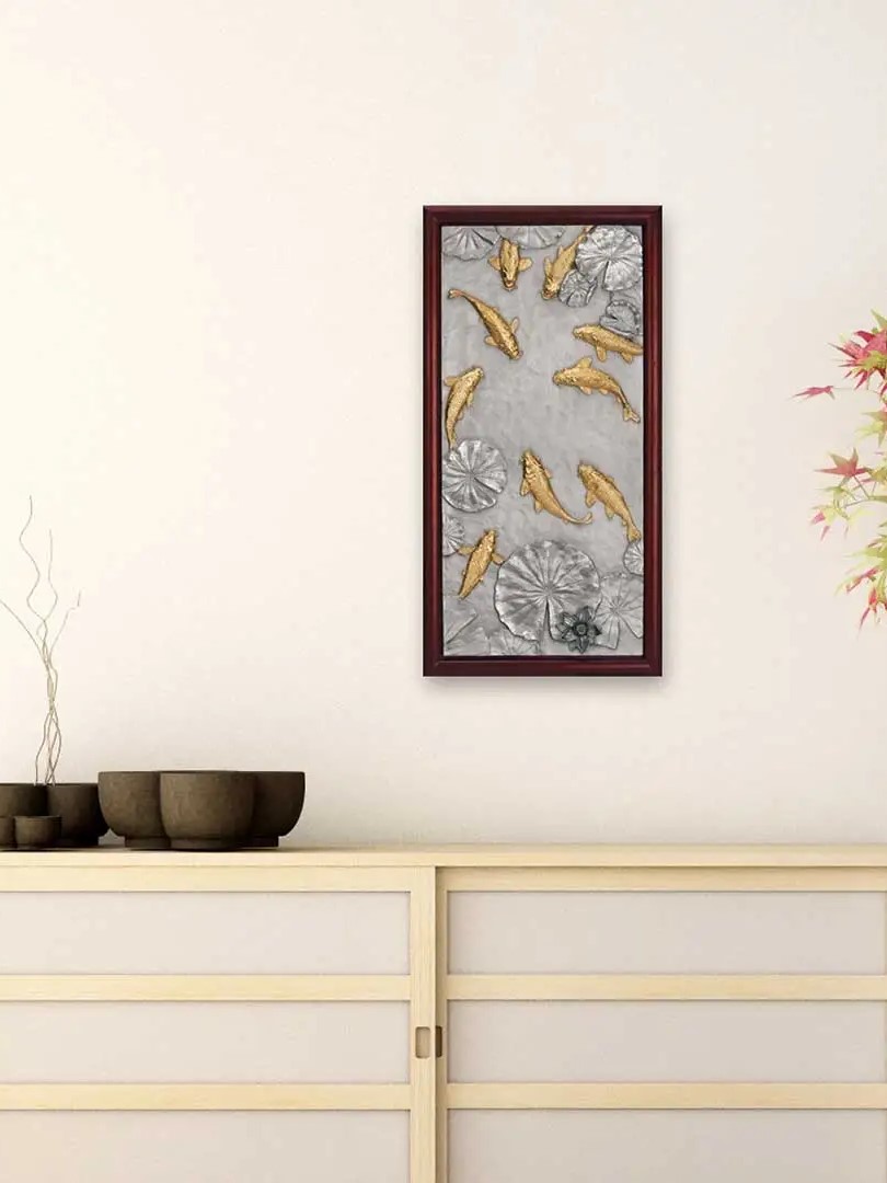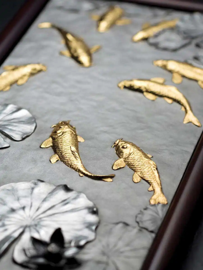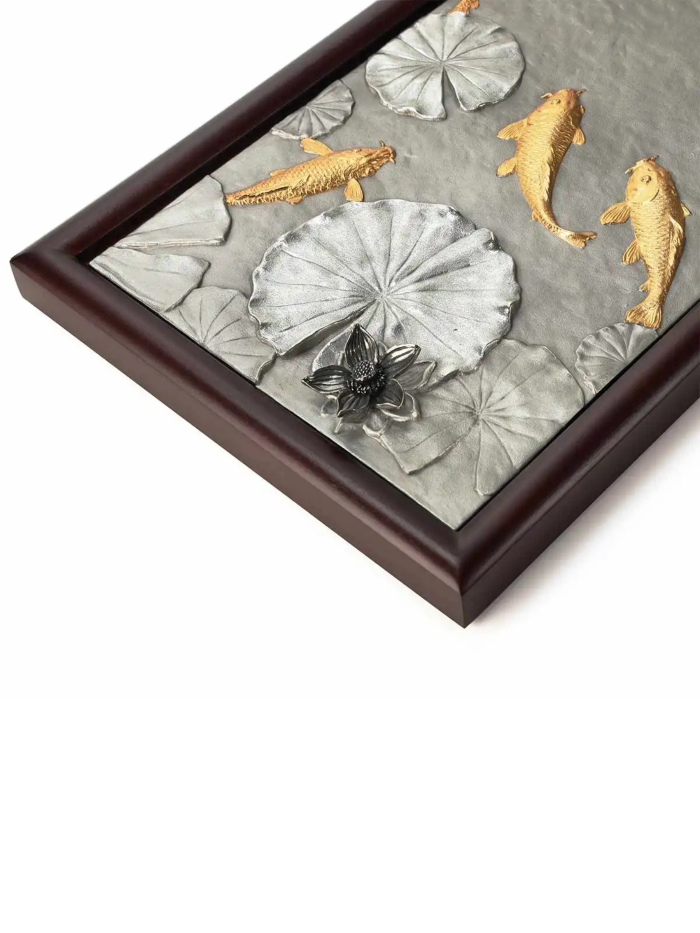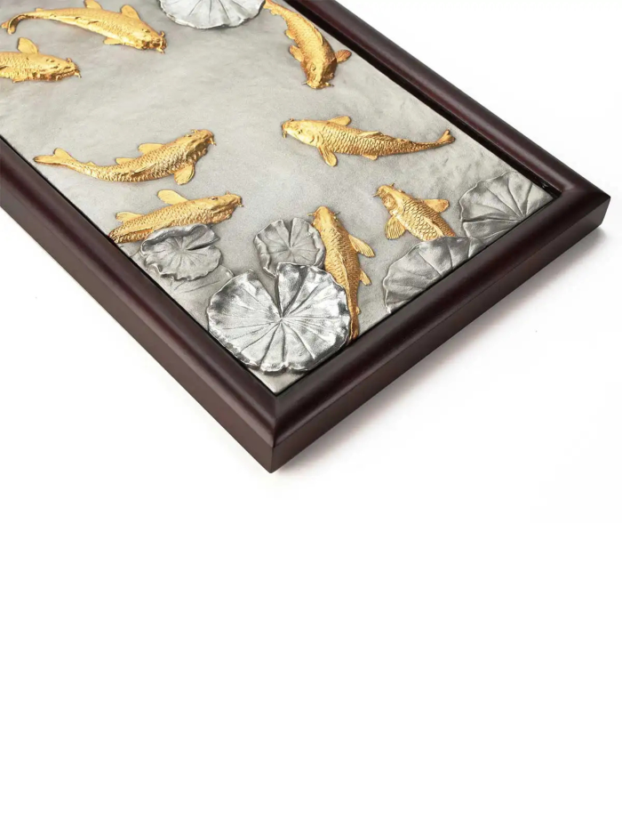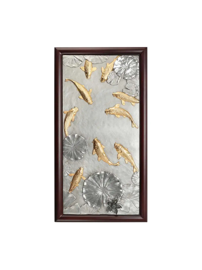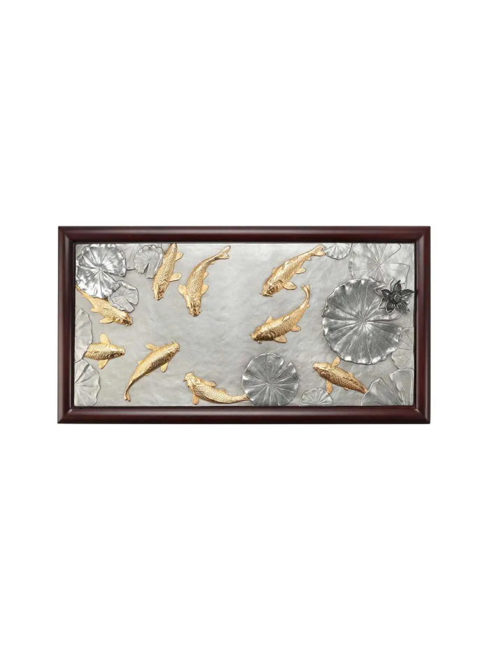 Tranh cửu ngư KOI tái hiện hình ảnh chín chú cá chép Nhật Bản mạ vàng 24K bơi lội thanh bình trên nền hồ nước với hoa sen, được chế tác từ chất liệu pewter tinh xảo. Sản phẩm là bức tranh treo tường đầy nghệ thuật, kết hợp hài hòa giữa vẻ đẹp truyền thống và sự tinh tế hiện đại. Ý nghĩa: Chủ đề cửu ngư tượng trưng cho sự thịnh vượng và sung túc mãi mãi. Chín chú cá chép tượng trưng cho sự lâu dài (chữ "cửu" đồng âm với "vĩnh cửu" trong tiếng Trung), trong khi cá là biểu tượng của sự dư dả và hoa sen biểu trưng cho sự thanh khiết và no đủ. Bức tranh khéo léo kết hợp các yếu tố truyền thống và giá trị thẩm mỹ, tạo nên một tác phẩm vừa trang nhã vừa ý nghĩa. Bức tranh mang lại sự cân bằng và hài hòa, thu hút tài lộc, may mắn và sự thịnh vượng cho gia chủ. Chất liệu: Cá chép mạ vàng 24K. Nền pewter cao cấp, mô phỏng mặt hồ nước với hoa sen. Kích thước: Cao: 45.5 cm, Rộng: 24 cm, Độ dày: 3.5 cm Sự lựa chọn hoàn hảo: Tranh cửu ngư KOI là món quà ý nghĩa và đẳng cấp dành tặng đối tác, khách hàng, hoặc làm điểm nhấn nghệ thuật trong không gian sống. Với sự kết hợp tinh tế giữa truyền thống và hiện đại, đây là lựa chọn lý tưởng cho những ai trân quý giá trị văn hóa và phong thủy. *Sản phẩm chưa bao gồm đế gỗ