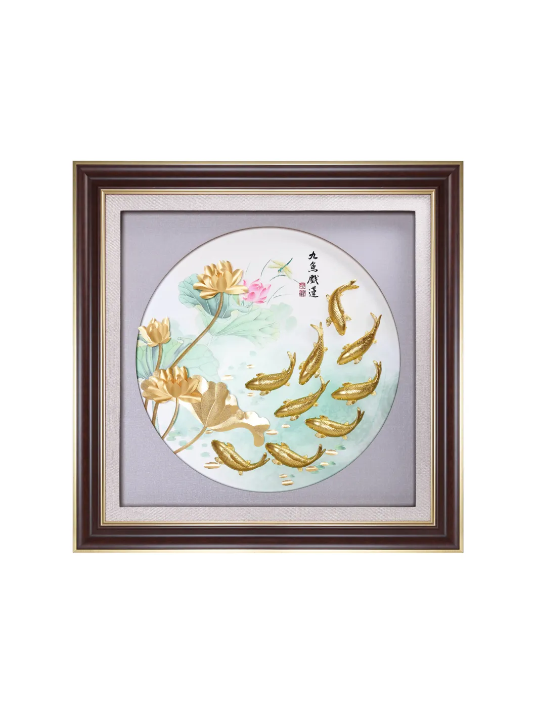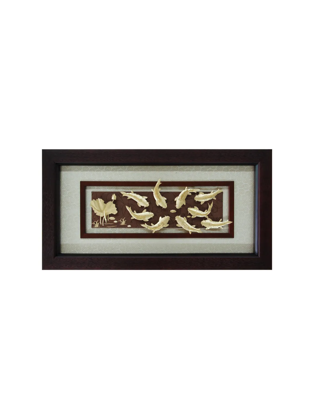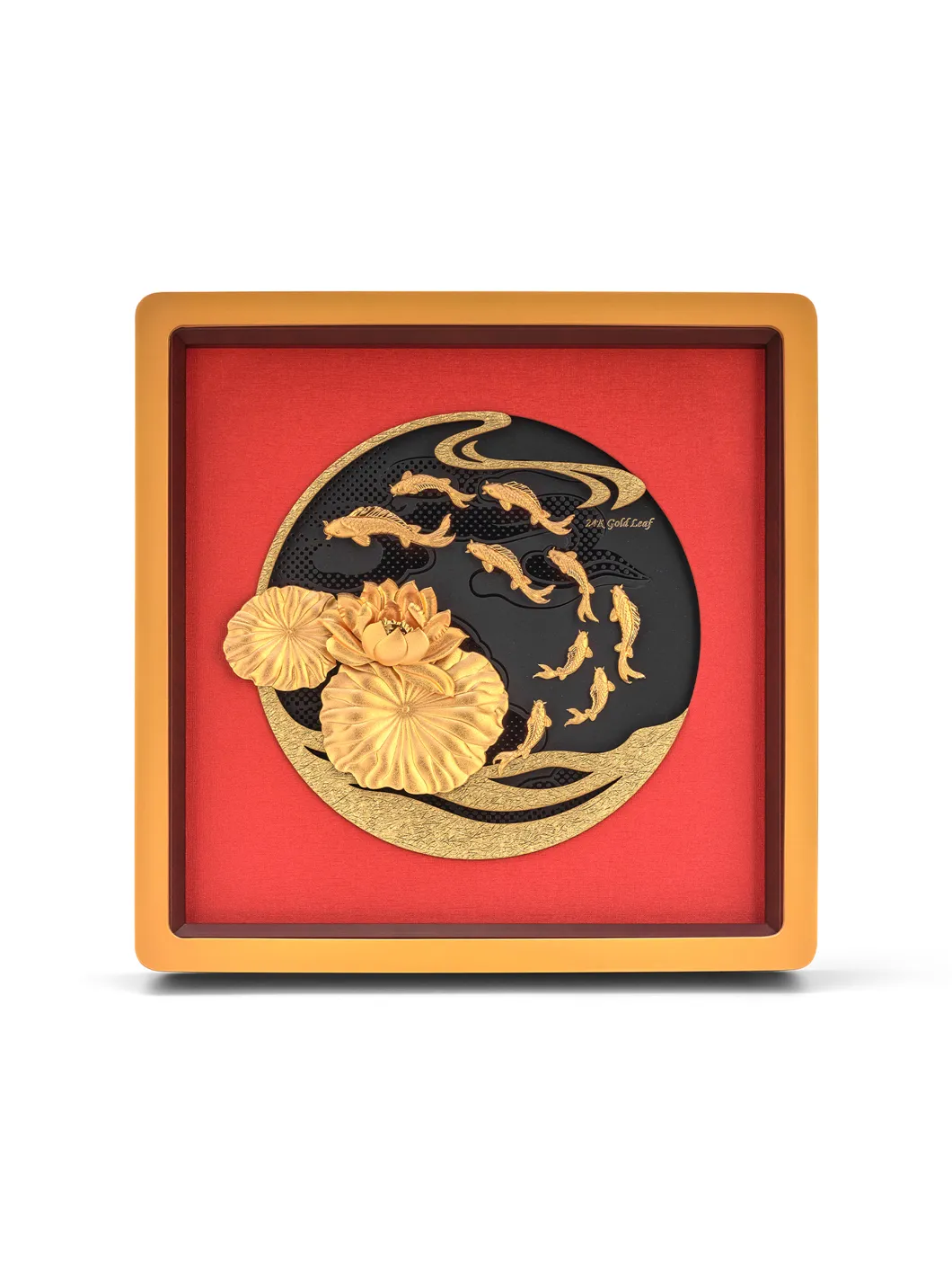 Tranh cửu ngư KOI tái hiện hình ảnh chín chú cá chép Nhật Bản mạ vàng 24K bơi lội thanh bình trên nền hồ nước với hoa sen, được chế tác từ chất liệu pewter tinh xảo. Sản phẩm là bức tranh treo tường đầy nghệ thuật, kết hợp hài hòa giữa vẻ đẹp truyền thống và sự tinh tế hiện đại. Ý nghĩa: Chủ đề cửu ngư tượng trưng cho sự thịnh vượng và sung túc mãi mãi. Chín chú cá chép tượng trưng cho sự lâu dài (chữ "cửu" đồng âm với "vĩnh cửu" trong tiếng Trung), trong khi cá là biểu tượng của sự dư dả và hoa sen biểu trưng cho sự thanh khiết và no đủ. Bức tranh khéo léo kết hợp các yếu tố truyền thống và giá trị thẩm mỹ, tạo nên một tác phẩm vừa trang nhã vừa ý nghĩa. Bức tranh mang lại sự cân bằng và hài hòa, thu hút tài lộc, may mắn và sự thịnh vượng cho gia chủ. Chất liệu: Cá chép mạ vàng 24K. Nền pewter cao cấp, mô phỏng mặt hồ nước với hoa sen. Kích thước: Cao: 45.5 cm, Rộng: 24 cm, Độ dày: 3.5 cm Sự lựa chọn hoàn hảo: Tranh cửu ngư KOI là món quà ý nghĩa và đẳng cấp dành tặng đối tác, khách hàng, hoặc làm điểm nhấn nghệ thuật trong không gian sống. Với sự kết hợp tinh tế giữa truyền thống và hiện đại, đây là lựa chọn lý tưởng cho những ai trân quý giá trị văn hóa và phong thủy. *Sản phẩm chưa bao gồm đế gỗ