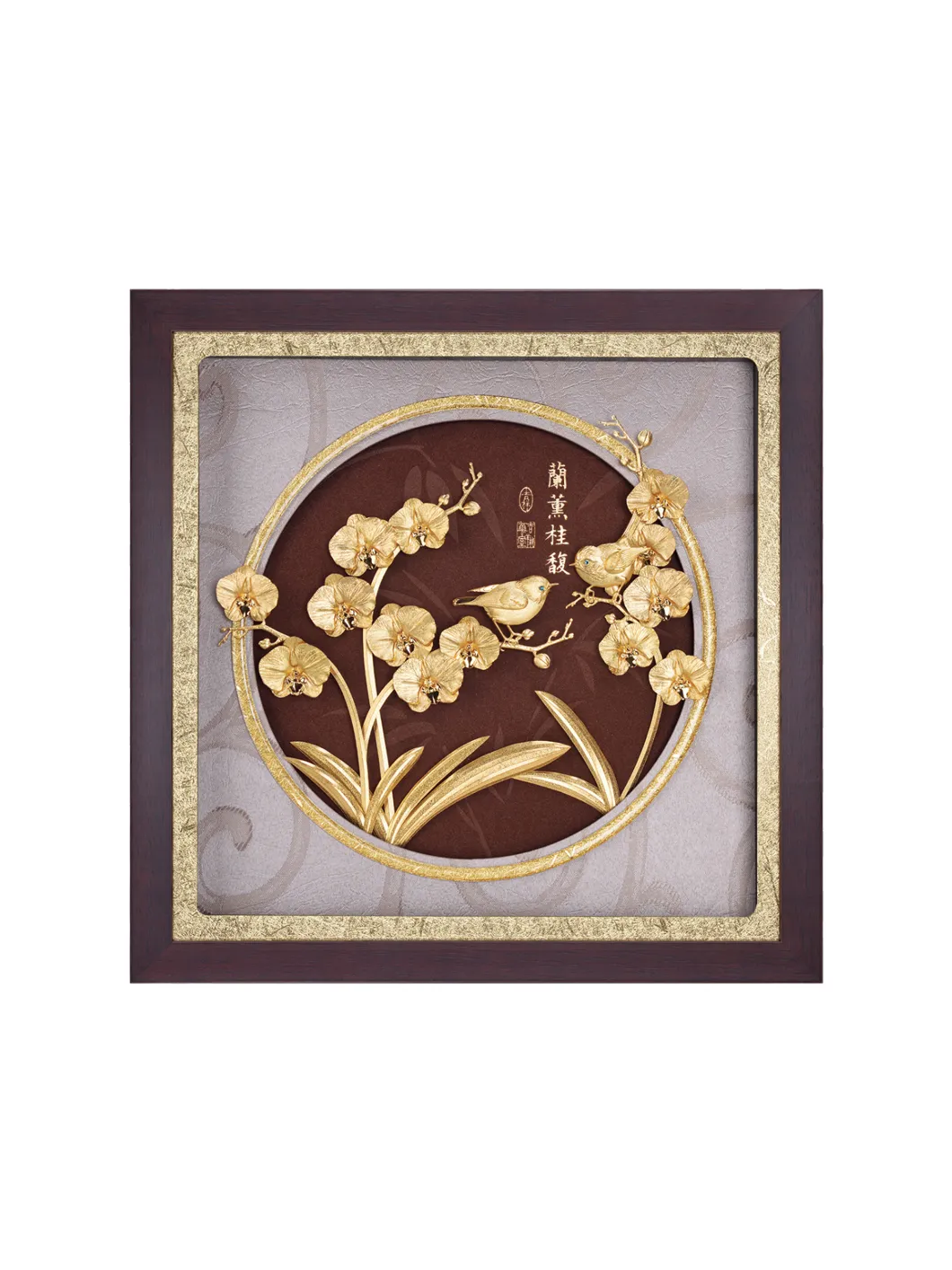 Hoa lan tượng trưng cho sự hoàn mỹ và được xem là biểu tượng trong các loài hoa. Vẻ đẹp của loài hoa này là biểu tượng cho sự sinh sôi tiền tài, của cải và sự toàn mỹ. Hoa lan còn đem lại may mắn và xua tan tà khí trong phong thủy. Chất liệu: vàng lá. Bảo quản nơi khô ráo Kích thước:30x30cm
