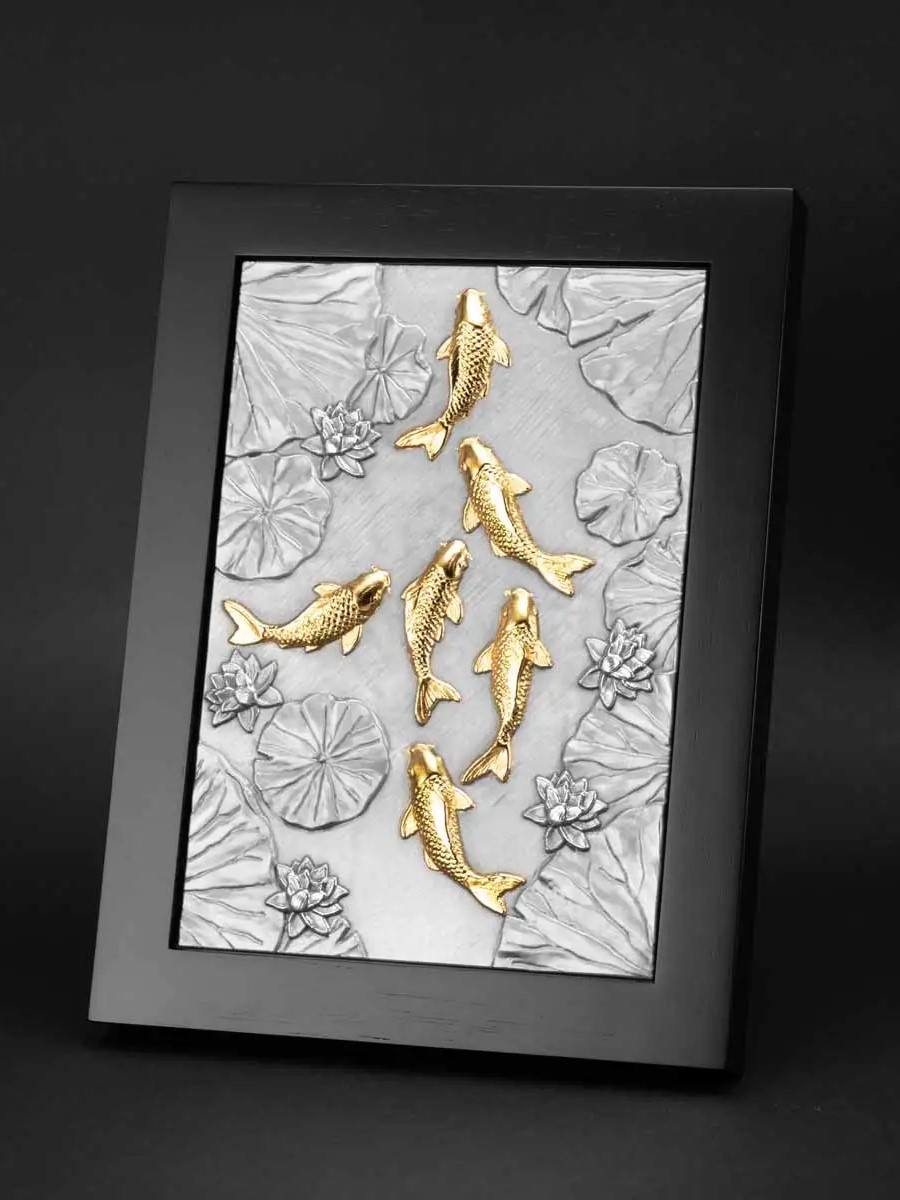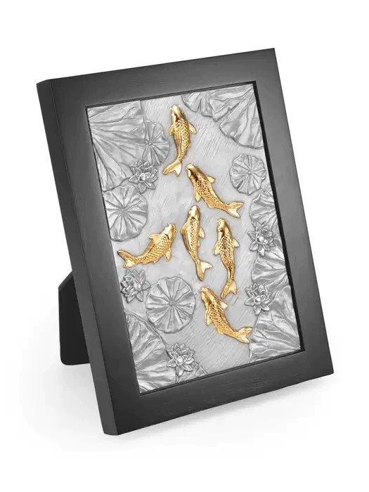 Tranh Lục Ngư Hoa Sen nổi bật với sáu chú cá chép mạ vàng Thụy Sĩ 24K bơi lội quanh hoa sen, biểu tượng cho sự thịnh vượng và suôn sẻ trong văn hóa Á Đông. Khung gỗ cao su sang trọng cùng tấm bảng khắc cá nhân giúp tác phẩm thêm phần ý nghĩa. Phù hợp để trang trí không gian hoặc làm quà tặng phong thủy cao cấp, tranh mang đến vận may, tài lộc và sự thanh bình. Ý nghĩa phong thủy: Sáu cá chép: Con số sáu trong văn hóa Trung Hoa tượng trưng cho sự suôn sẻ và thành công. Sáu chú cá chép bơi lội uyển chuyển quanh hoa sen thể hiện sự hài hòa, thịnh vượng và tiến triển thuận lợi. Hoa sen: Biểu tượng của sự thanh khiết, trí tuệ và sự giác ngộ, tôn lên giá trị tinh thần và nghệ thuật của bức tranh. Ứng dụng: Trang trí: Hoàn hảo cho không gian gia đình hoặc văn phòng, giúp tạo điểm nhấn sang trọng và mang lại vận khí tốt. Quà tặng: Lý tưởng để làm quà tặng phong thủy cao cấp cho đối tác, khách hàng hoặc người thân. Chất liệu: Cá chép được mạ vàng Thụy Sĩ 24K nổi bật với họa tiết sắc nét, sống động. Khung tranh làm từ gỗ cao su, mang lại vẻ tự nhiên và sang trọng. Đi kèm bảng khắc cá nhân kích thước 10 cm x 2 cm, hoàn hảo cho việc khắc tên hoặc thông điệp. Kích thước: Cao 28 cm x Dài 21 cm x Rộng 2.3 cm