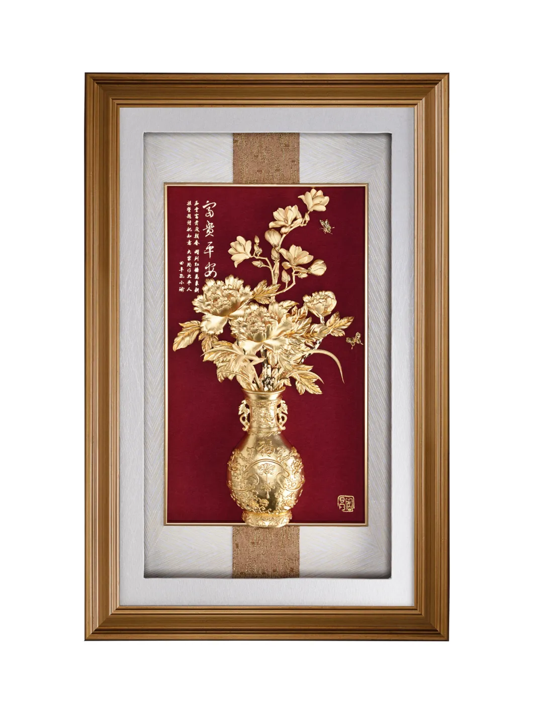 Trong phong thủy, hoa Mộc Lan được tin rằng đem đến nhiều vượng khí cho ngôi nhà, tạo nhiều thuận lợi cho con đường thăng tiến. Ngoài ra hoa mộc lan kết hợp với mẫu đơn sẽ tăng thêm vận khí, tài lộc và địa vị cho căn nhà cũng như dòng tộc. Chất liệu: vàng lá. Bảo quản nơi khô ráo. Kích thước: 29x17x36cm