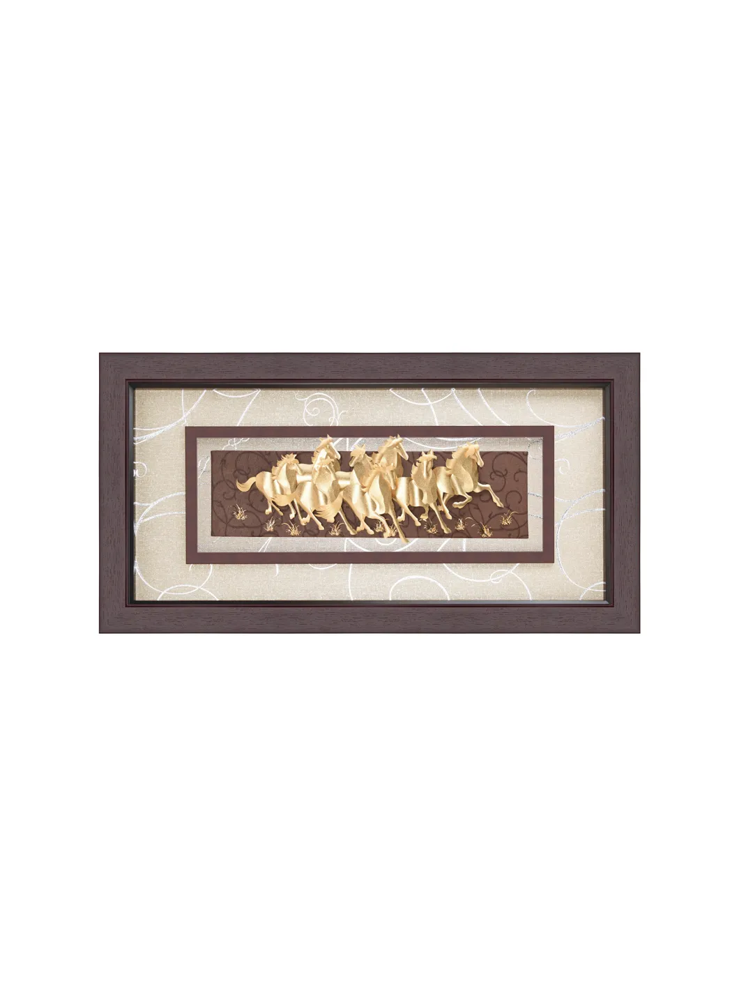 Tranh mã đáo thành công với hình ảnh 8 chú ngựa cùng phi nước đại về 1 hướng, biểu trưng cho sự may mắn, phát đạt trong kinh doanh. thăng tiến, thành công trong công việc. Chất liệu: vàng lá. Bảo quản nơi khô ráo. Kích thước: 42 x 81 cm