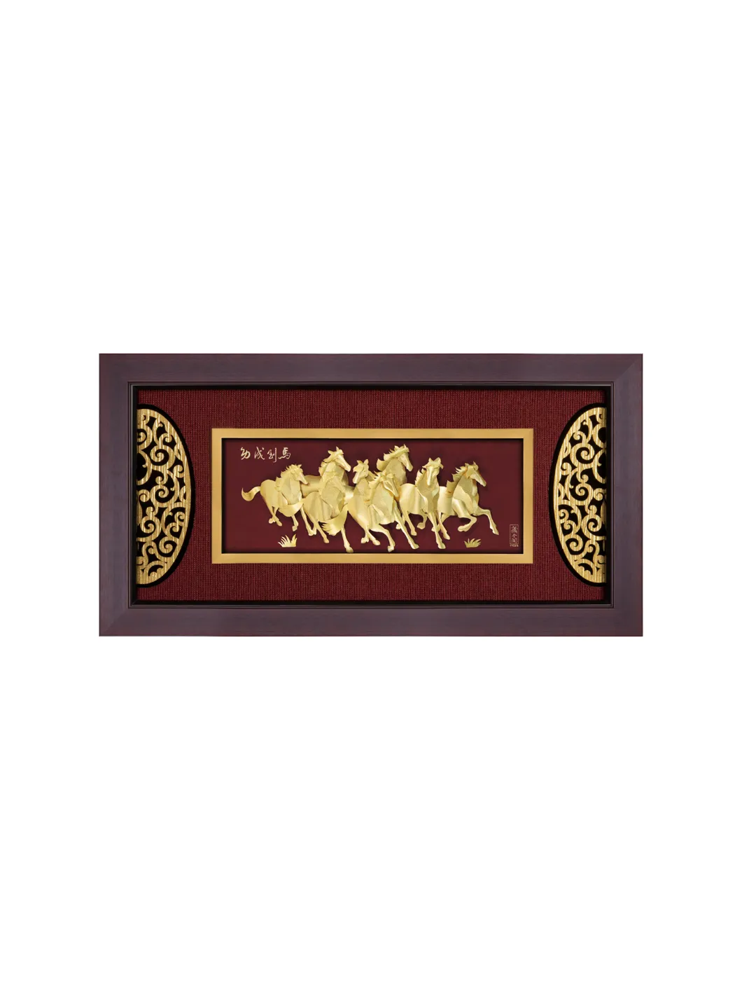 Tranh mã đáo thành công với hình ảnh 8 chú ngựa cùng phi nước đại về 1 hướng, biểu trưng cho sự may mắn, phát đạt trong kinh doanh. thăng tiến, thành công trong công việc. Chất liệu: vàng lá. Bảo quản nơi khô ráo. Kích thước: 42 x 81 cm
