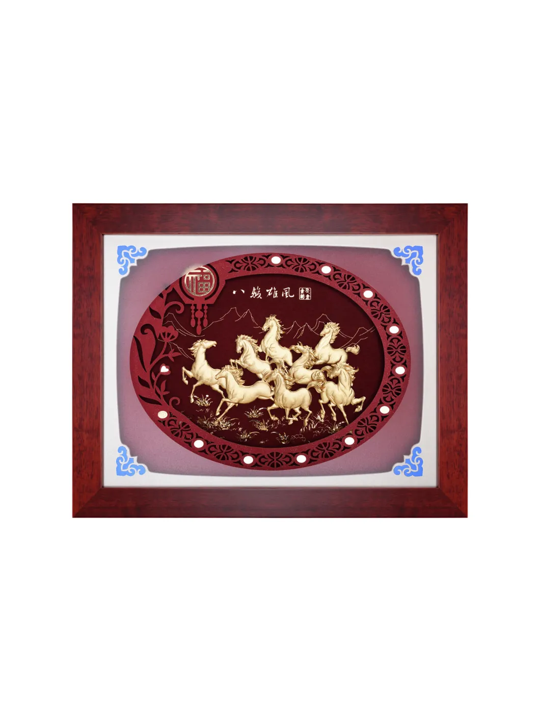 Con ngựa không những là con vật trung thành nhất, ngựa còn là biểu tượng của sự kiên nhẫn, bền bỉ, lâu dài, là con vật mang lại sự may mắn, tài lộc, sự phát đạt trong kinh doanh, sự nhanh nhạy và tăng tiến tiền tài. Chất liệu: vàng lá. Bảo quản nơi khô ráo. Kích thước: 26x33 cm