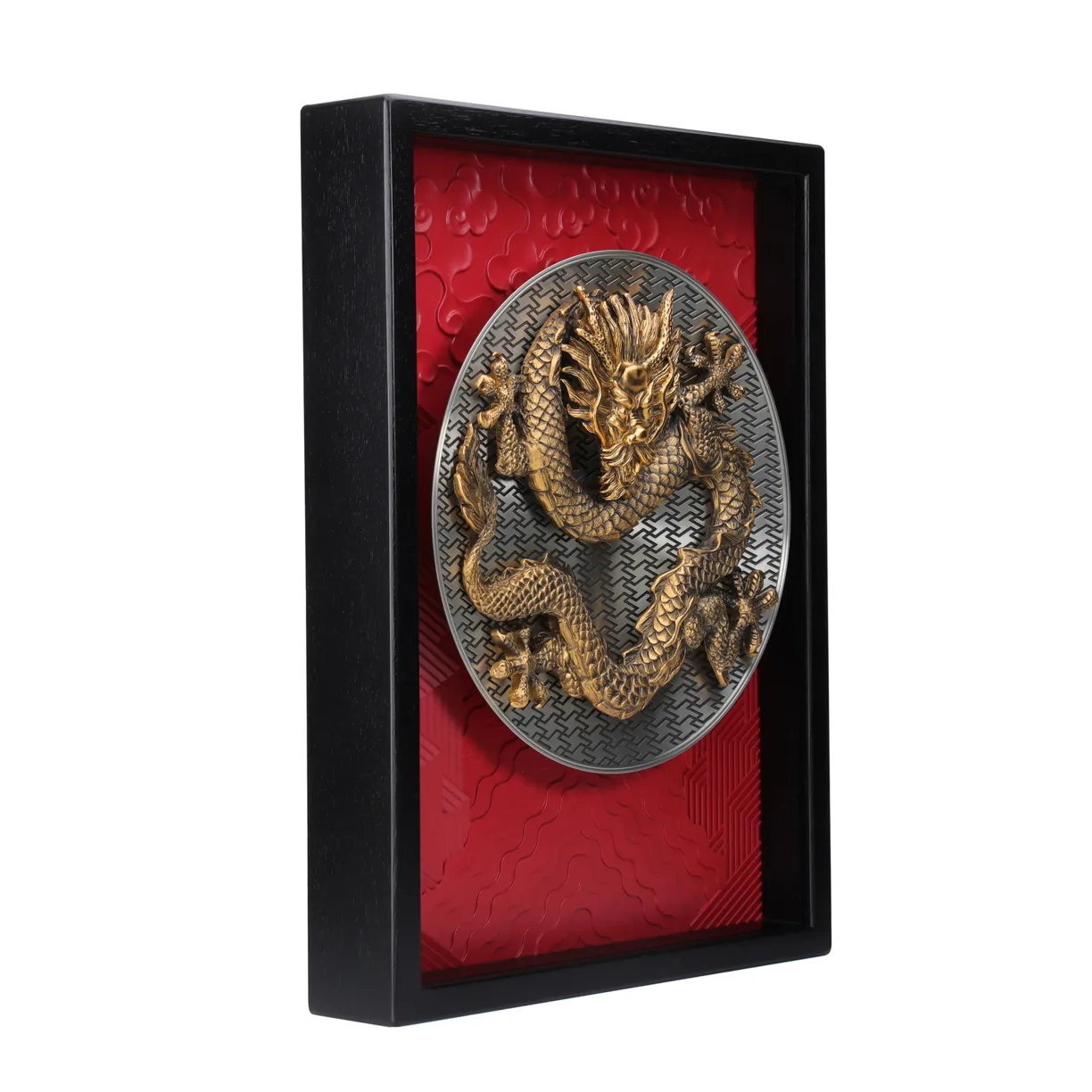 Tranh phù điêu rồng được mạ vàng 24K hiện ra nổi bật. Sóng, đá và mây cách điệu tạo trên nền ấn tượng bằng nhựa composite màu đỏ thẫm. Hình đĩa và khung chữ nhật của tranh phù điêu thể hiện cho hình tượng bầu trời và mặt đất, là sự hòa hợp.