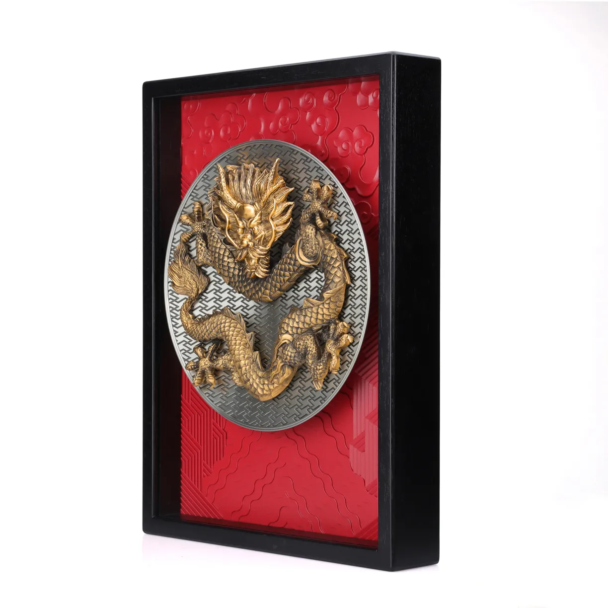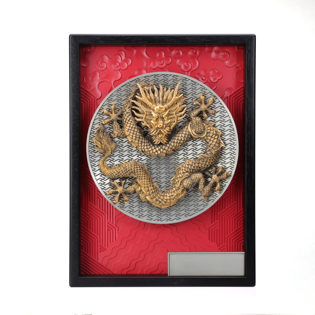 Tranh phù điêu rồng dũng mạnh có thêm một tấm khắc 4cm x 12cm để ghi dấu ấn cá nhân hóa theo cả chiều ngang hay dọc, nó có khe cắm tích hợp với khung tranh.