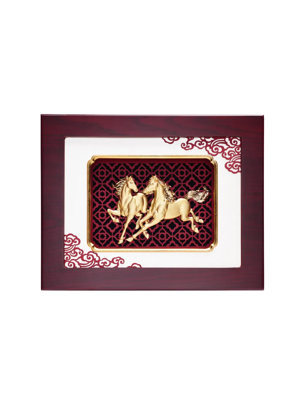 Con ngựa không những là con vật trung thành nhất, ngựa còn là biểu tượng của sự kiên nhẫn, bền bỉ, lâu dài, là con vật mang lại sự may mắn, tài lộc, sự phát đạt trong kinh doanh, sự nhanh nhạy và tăng tiến tiền tài. Chất liệu: vàng lá. Bảo quản nơi khô ráo. Kích thước: 27x34 cm
