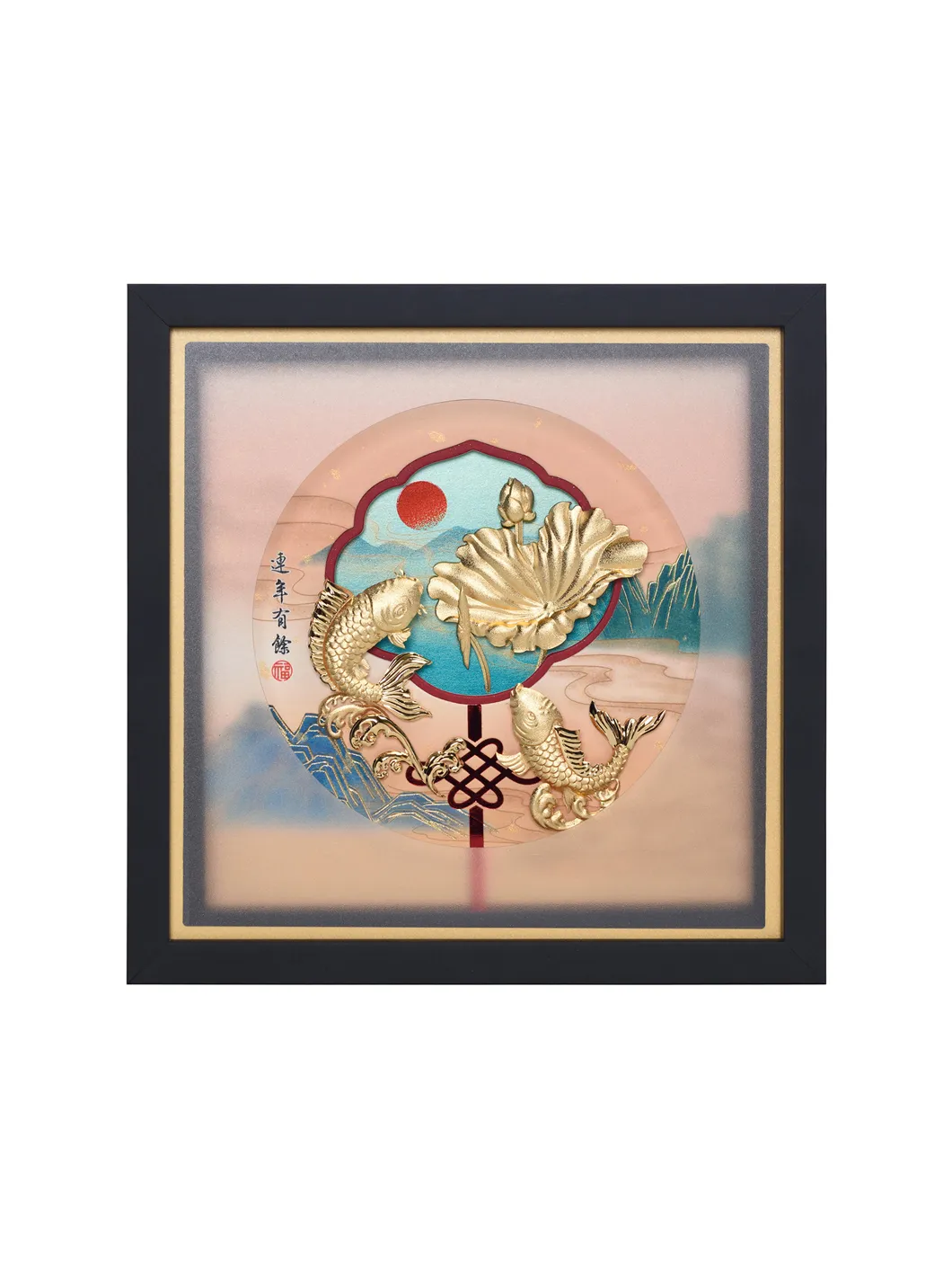 Hoa Sen là biểu tượng trưng cho sự thanh cao, thoát tục và hoàn mỹ . Bên cạnh sự thanh khiết tuyệt vời của hoa, Sen còn giúp điều hòa khí vượng, tăng cường năng lượng tốt và ngăn chặn những điều xấu. Đôi cá vàng tượng trưng cho sự dư giả tài lộc , cuộc sống hạnh phúc đủ đầy. Tổng thể tạo nên bức tranh mang ý nghĩa hạnh phúc , tài lộc dài lâu. Chất liệu: vàng lá. Bảo quản nơi khô ráo Kích thước: 20x20cm
