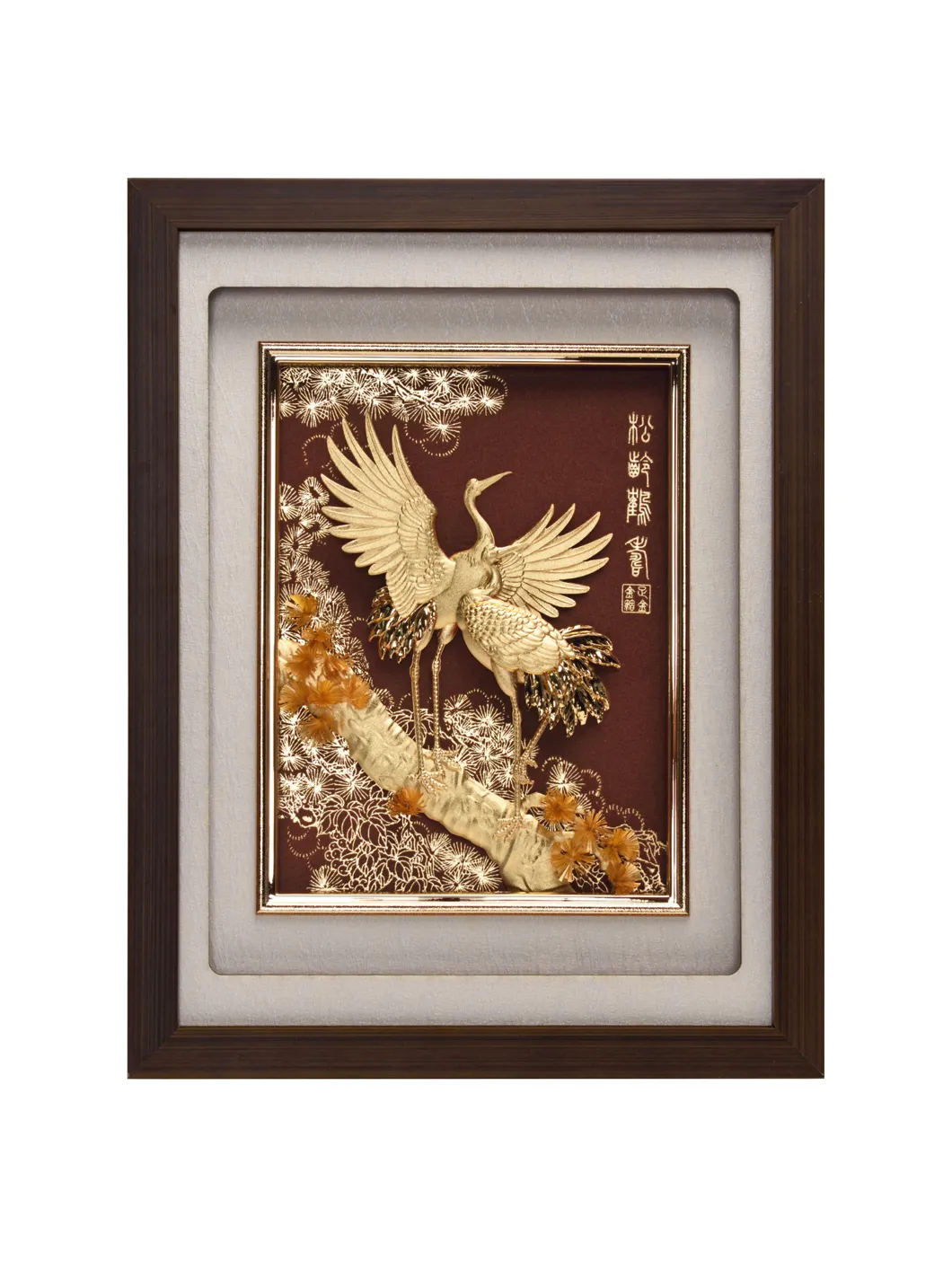 Tranh Tùng Hạc diên niên là bức tranh chứa đựng ý nghĩa của khí tiết thanh cao, trí tuệ sáng suốt, thể hiện biểu tượng của sự trường thọ và gắn bó vững bền vĩnh cửu. Ngoài hai hình tượng cây Tùng và chim Hạc, hai chữ Hán Việt “diên niên” có nghĩa là lâu năm cũng mang ý nghĩa về trường thọ, an lạc. Chất liệu: vàng lá. Bảo quản nơi khô ráo Kích thước: 25x32cm
