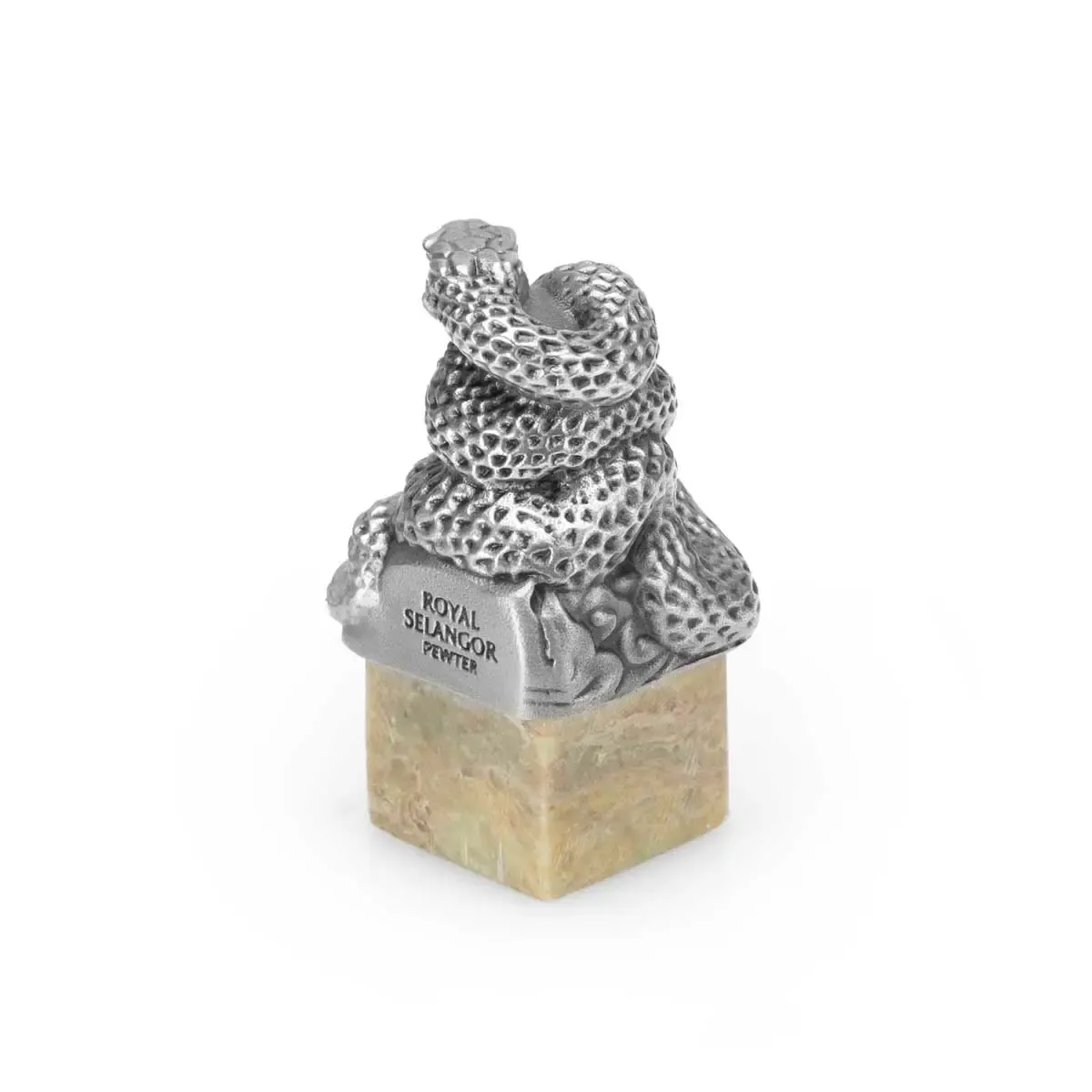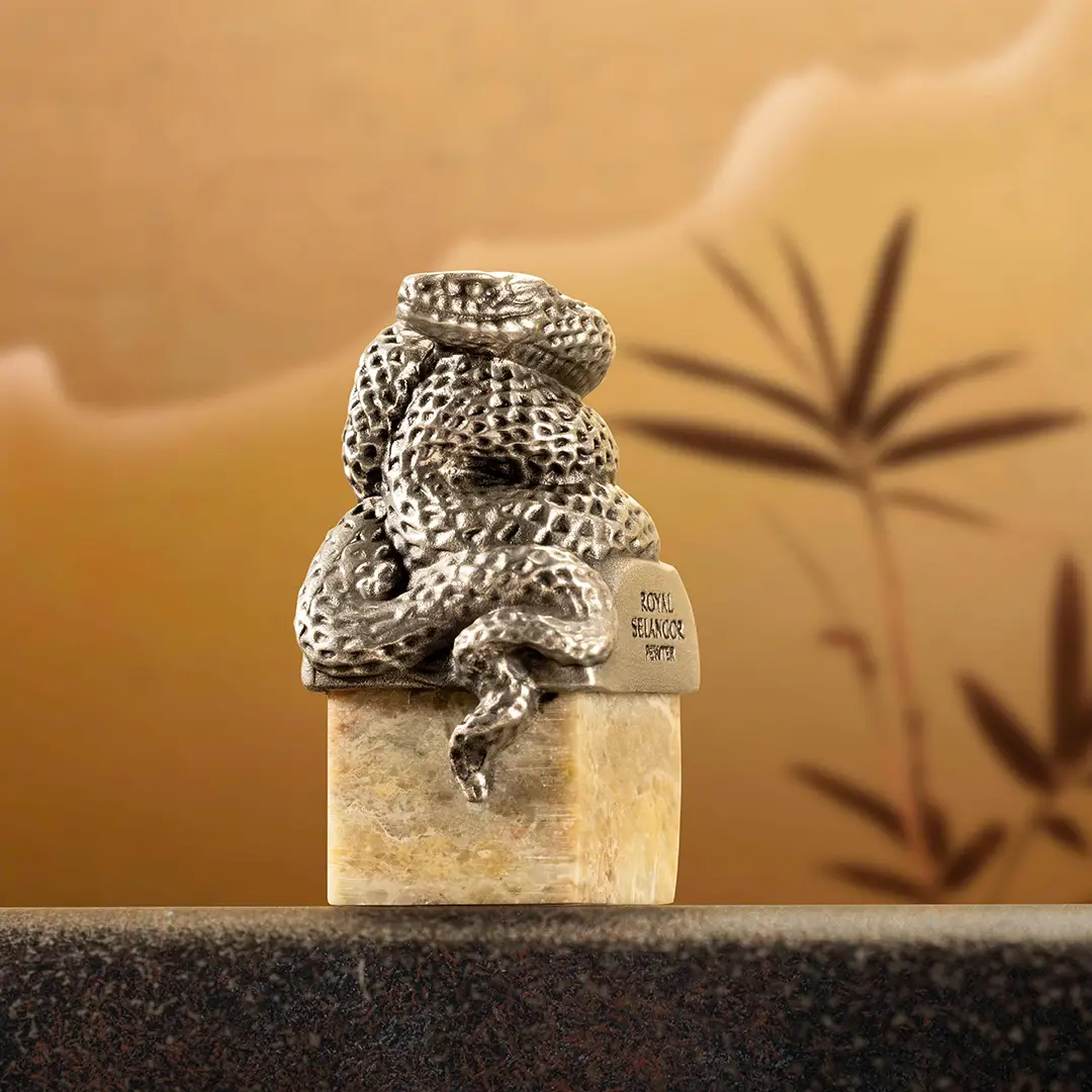 Con rắn, cuộn tròn với dáng dấp thực sự mãn nguyện, đang nằm yên bình trên bệ đá. Mỗi một món linh vật của Royal Selangor đều có đường nét thiết kế và hoạ tiết tinh xảo, vừa là quà tặng trang trí tuyệt vời, vừa là đồ phong thủy đầy ý nghĩa khi rắn được cho là mang lại năng lượng tốt lành, tăng cường trực giác và sự nhạy bén về mặt chiến lược, khiến chúng đặc biệt có lợi cho môi trường kinh doanh. Kích thước: H4.5cm x 2.5cm x 2.6cm