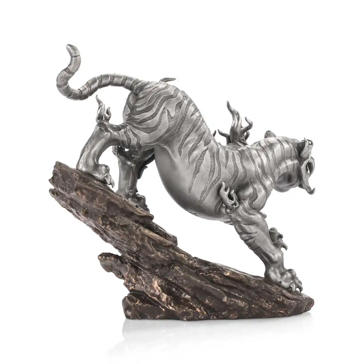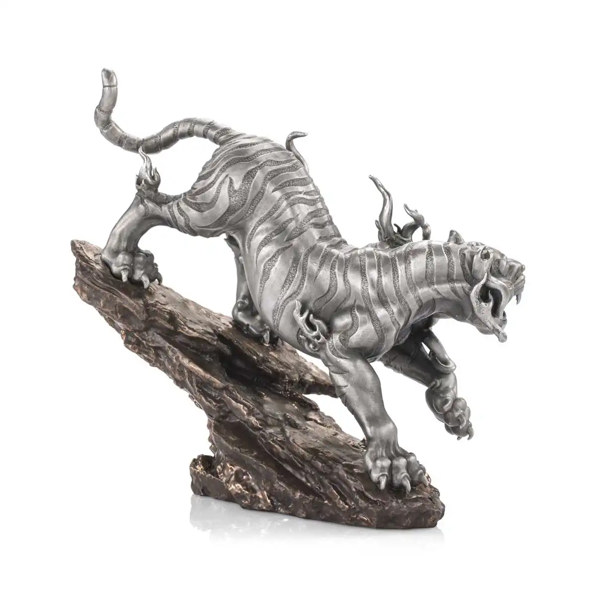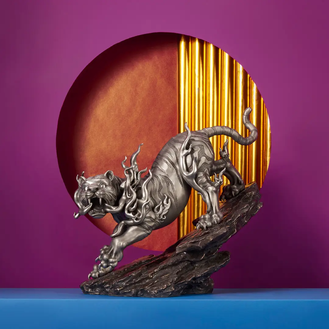 Tượng Bạch Hổ size L tái hiện hình ảnh oai hùng và bất khuất của thần hổ trắng, một trong Tứ Tượng linh thiêng trong văn hóa Á Đông. Dưới bàn tay điêu luyện của nghệ sĩ điêu khắc Từ Hiểu Dũng (Xu Xiao Yong) - bậc thầy của nghệ thuật tạo hình Trung Hoa đương đại - từng cơ bắp, chuyển động và thần thái uy nghi của Bạch Hổ đều được khắc họa sống động và đầy khí chất. Bao quanh thân tượng là những ngọn lửa vũ trụ uốn lượn, gợi cảm giác như hổ đang gầm vang và bước ra khỏi chiều không gian để bảo vệ phương Tây. Ý nghĩa phong thủy và biểu tượng: Bạch Hổ là linh thú trấn giữ phương Tây, đại diện cho mùa Thu, buổi hoàng hôn và hành Kim. Dù toát lên vẻ dữ dằn và mãnh liệt, Bạch Hổ cũng là biểu tượng của năng lượng âm – sự cẩn trọng, khôn ngoan và trực giác sắc bén, là trợ lực mạnh mẽ trong kinh doanh, chính trị và các lĩnh vực cần quyết đoán lẫn kiên định. Theo truyền thuyết, Bạch Hổ cũng là hiện thân của người chiến binh lý tưởng – trung thành, quả cảm và luôn bảo vệ lẽ phải. Chất liệu và hoàn thiện: Chế tác thủ công từ pewter cao cấp, không chứa chì - đảm bảo an toàn và tính thẩm mỹ lâu dài. Đặt trên đế nhựa tổng hợp ánh đồng (bronze-hued composite resin), tạo nền vững chãi và đậm chất phong thủy. Kích thước: Chiều cao (gồm đế): 31,5cm, Chiều dài: 34,5cm, Chiều rộng: 17cm Sự lựa chọn hoàn hảo: Tượng Bạch Hổ size L là lựa chọn lý tưởng cho doanh nhân, lãnh đạo, hoặc những ai mong muốn tìm một biểu tượng trấn trạch, tăng cường khí chất uy quyền và chiêu tài. Thích hợp để trưng bày tại phòng làm việc, phòng họp, sảnh tiếp khách hoặc phòng phong thủy, như một báu vật bảo hộ - mang lại sức mạnh, sự bảo vệ và trường khí vượng thịnh.