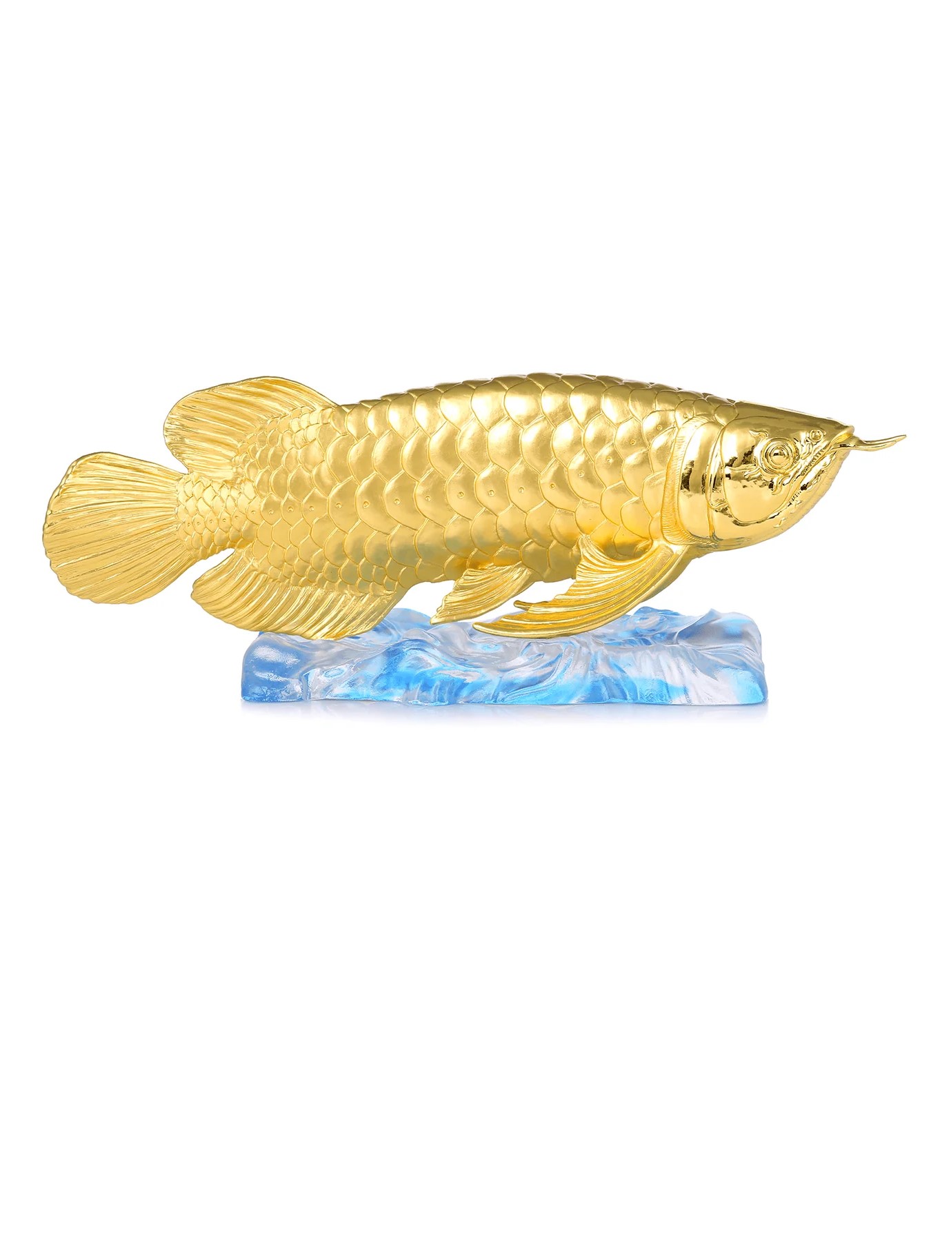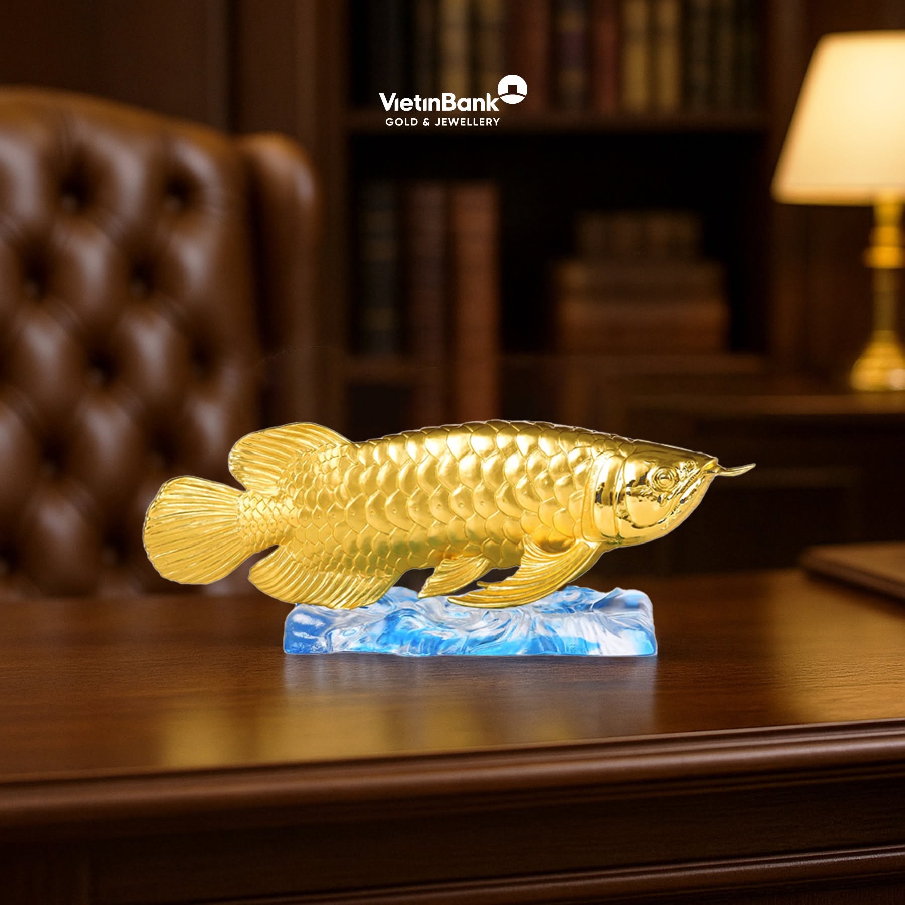 Tượng Cá Rồng Bảo Vật từ thương hiệu RISIS Singapore là một kiệt tác nghệ thuật kết hợp giữa vẻ đẹp uy nghi và ý nghĩa phong thủy sâu sắc. Cá rồng được mạ vàng Thụy Sĩ 24K, nổi bật trên đế đá Liu Li màu xanh lam - tượng trưng cho làn nước chảy, tạo nên cảm giác sống động, hài hòa và tràn đầy năng lượng. Ý nghĩa phong thủy: Thịnh vượng và tài lộc: Cá rồng – loài cá nước ngọt sống lâu nhất, từ lâu được xem là biểu tượng của tài vận dồi dào, may mắn và sự thịnh vượng trong kinh doanh. Sức mạnh và quyền uy: Với dáng bơi uyển chuyển nhưng dũng mãnh, tượng cá rồng mang theo nguồn năng lượng bảo vệ và phát triển sự nghiệp, đặc biệt phù hợp với doanh nhân và người làm kinh doanh. Yếu tố nước trong phong thủy: Đế Liu Li xanh tượng trưng cho hành Thủy – yếu tố kích hoạt dòng chảy tài lộc và cân bằng năng lượng trong không gian. Chất liệu: Cá rồng: Kim loại cao cấp mạ vàng Thụy Sĩ 24K Đế: Đá Liu Li xanh lam thủ công, tượng trưng cho sóng nước Kích thước: Dài: 35 cm, Rộng: 11.5 cm, Cao: 15 cm Trọng lượng: 4.5 kg Sự lựa chọn hoàn hảo: Quà tặng cao cấp: Là món quà đẳng cấp, ý nghĩa dành cho đối tác, doanh nhân hoặc người thân trong các dịp như khai trương, tân gia, kỷ niệm. Trang trí không gian sang trọng: Phù hợp để trưng bày tại phòng làm việc, phòng khách, quầy lễ tân hoặc showroom – nơi cần kích hoạt vượng khí và thể hiện đẳng cấp cá nhân. Tượng Cá Rồng Bảo Vật không chỉ là một tác phẩm mỹ nghệ tuyệt vời mà còn là biểu tượng của tài lộc trường tồn và uy lực mạnh mẽ – lựa chọn hoàn hảo cho những ai khao khát thành công và thịnh vượng.