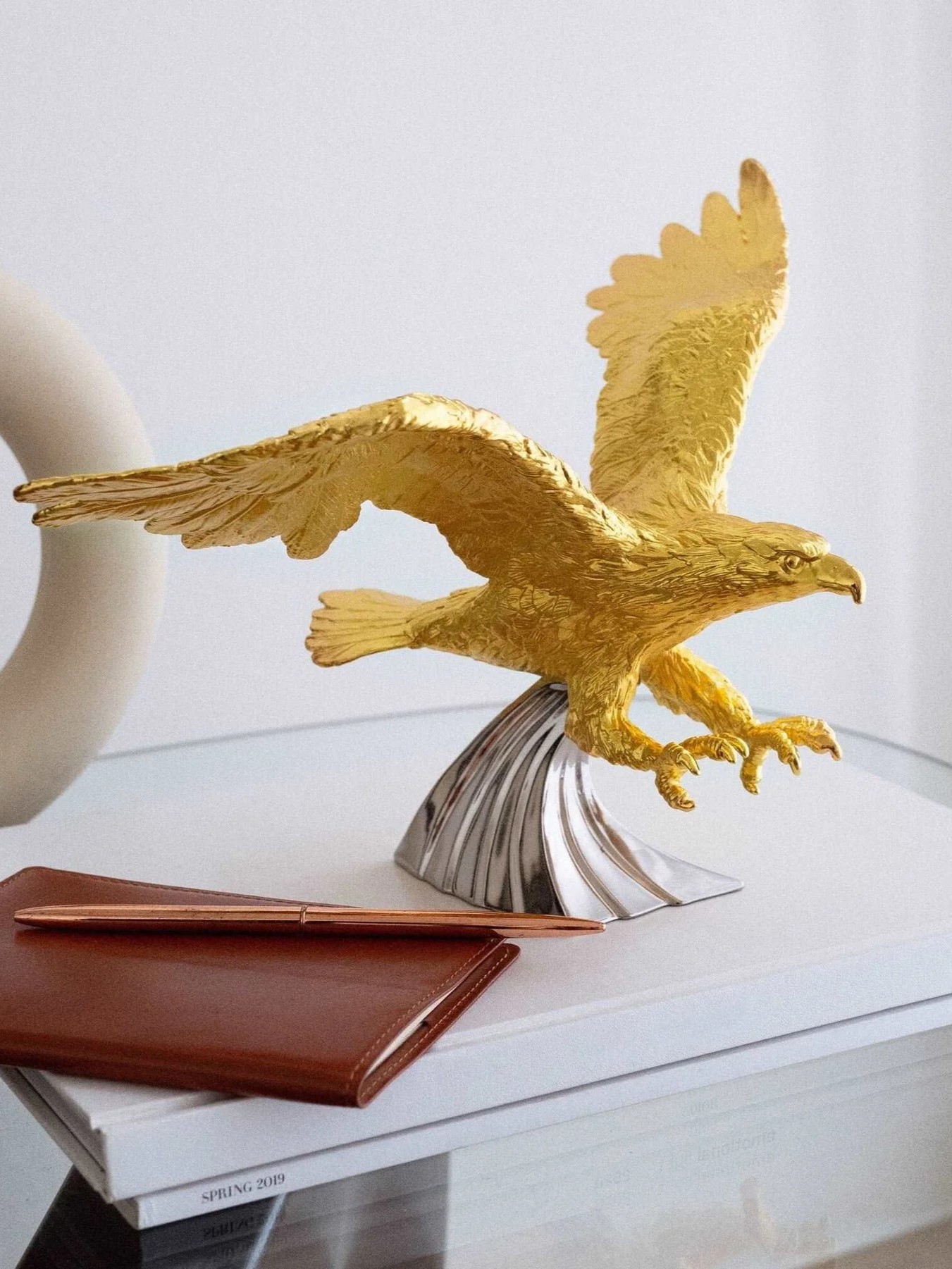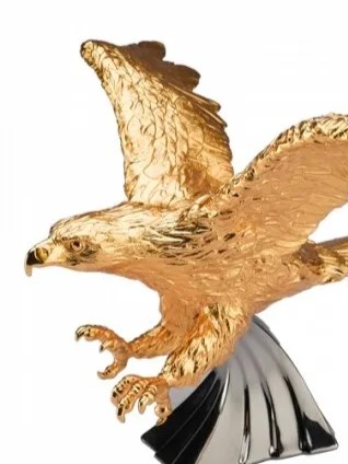 Đại bàng tượng trưng cho quyền lực và sức mạnh, được coi là vị chúa tể bầu trời rộng lớn. Bức tượng đại bàng phương bắc giang rộng đôi cánh, giương móng sẵn sàng nhắm tới con mồi thể hiện sức mạnh và thành công. Tượng đại bàng mạ vàng 24k, đế hình ngọn sóng mạ platinum.
