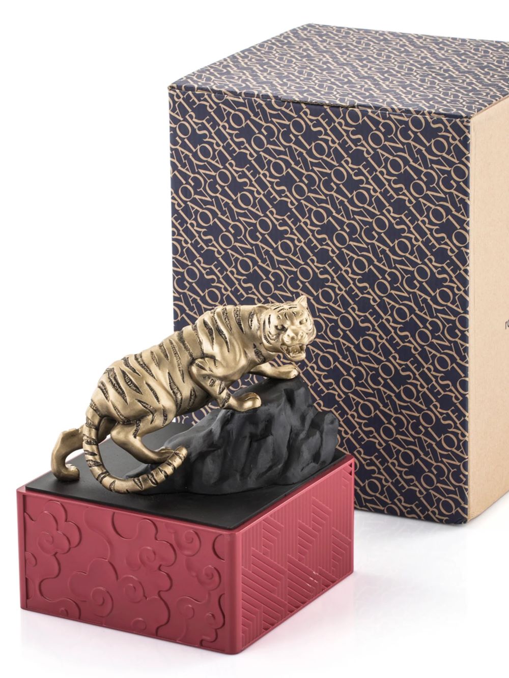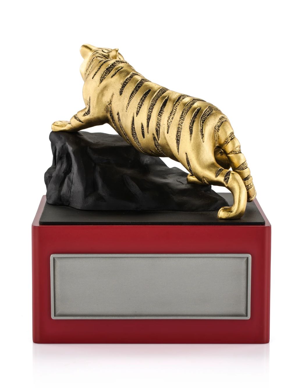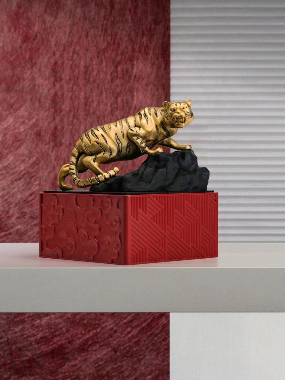 Tượng Hổ vàng thịnh vượng được chế tác từ pewter cao cấp, mạ vàng 24K rực rỡ, tái hiện hình ảnh chú hổ uy mãnh đang vươn mình đứng trên mỏm đá - một tư thế thể hiện sự tự tin, ý chí bền bỉ và khả năng tiên đoán tương lai. Thiết kế sắc sảo kết hợp cùng các họa tiết trừu tượng như sóng nước, mây trời và vách đá, tượng trưng cho sức mạnh và sự hòa hợp của các yếu tố tự nhiên. Nền đế màu đỏ thẫm càng tôn vinh vẻ uy nghi và phong thủy cát tường cho tác phẩm. Ý nghĩa: Về biểu tượng: Hổ là con giáp đứng thứ ba trong 12 cung hoàng đạo, đại diện cho quyền lực, dũng cảm và tinh thần lãnh đạo. Trong dân gian, hình tượng hổ còn mang ý nghĩa hộ mệnh, trấn trạch, trừ tà và thu hút vượng khí. Về thiết kế: Tư thế đứng kiêu hãnh của tượng hổ như một lời khẳng định mạnh mẽ cho những người mang khát vọng vươn lên, luôn chủ động đối mặt với thử thách. Phong thủy: Màu vàng kết hợp cùng đế đỏ tượng trưng cho tài lộc, thịnh vượng và may mắn, rất phù hợp trưng bày trong phòng khách, phòng làm việc hay làm quà tặng cho người tuổi Dần, tuổi Ngọ hoặc những người có tố chất lãnh đạo. Chất liệu: Pewter cao cấp mạ vàng 24K. Kích thước: Cao 19cm (bao gồm đế) x 14cm x 14cm. Phụ kiện đi kèm: Tấm biển pewter 4x12cm có thể khắc tên hoặc lời chúc theo yêu cầu riêng – một điểm nhấn cá nhân hóa độc đáo và đầy ý nghĩa. Sự lựa chọn hoàn hảo: Tượng Hổ vàng thịnh vượng là món quà phong thủy cao cấp, thích hợp tặng đối tác kinh doanh, cấp trên, người thân hoặc bạn bè trong dịp mừng tuổi, khai trương, thăng chức, hoặc chào đón năm mới. Sự kết hợp giữa thủ công tinh xảo và giá trị biểu tượng khiến sản phẩm trở thành món quà không chỉ đẹp mà còn truyền cảm hứng mạnh mẽ cho người nhận.