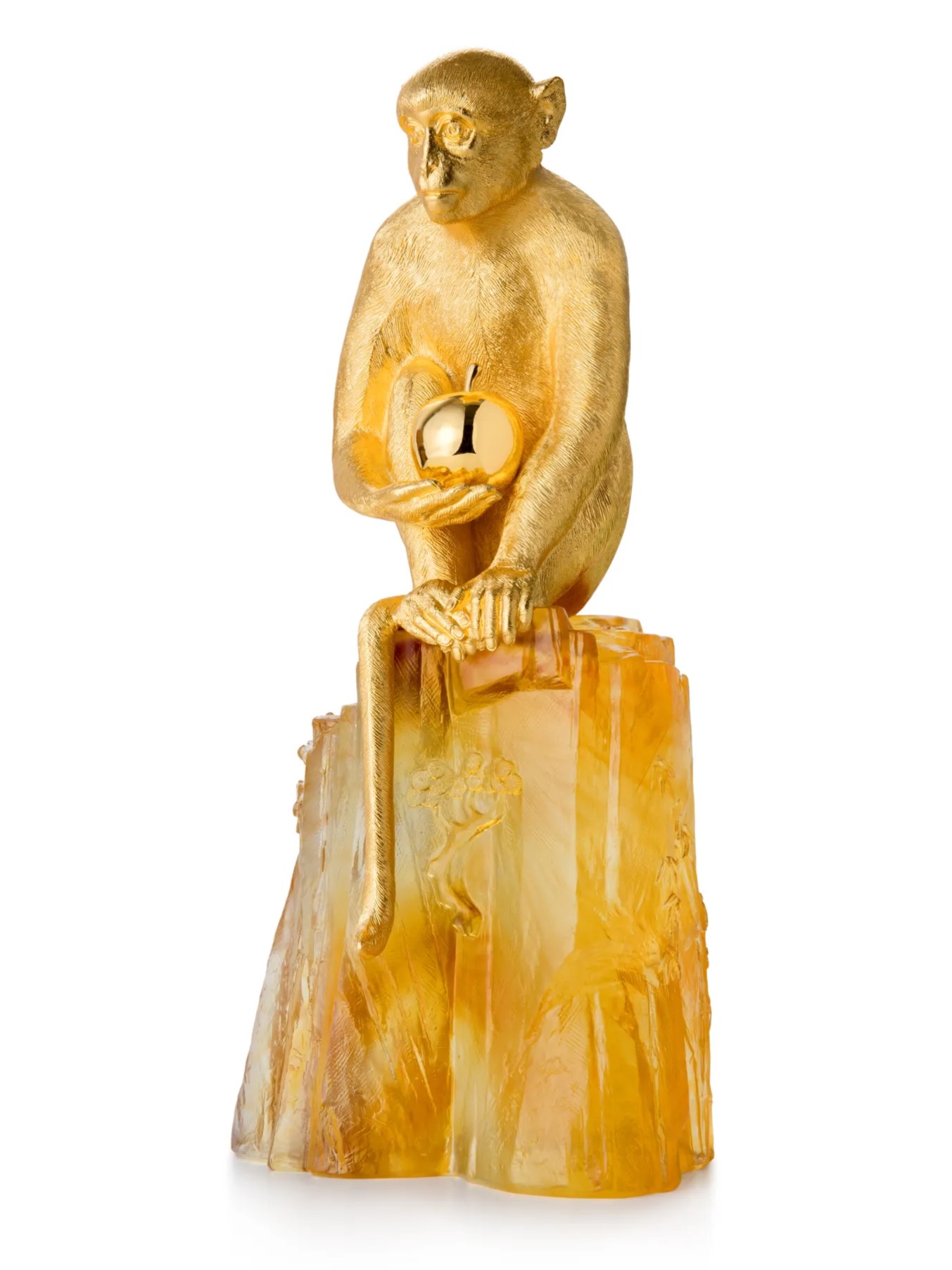 Tượng khỉ vàng bình an với hình ảnh chú khỉôm trái táo tượng trưng cho sự an khang, tốt lành, mắt hướng về phía xa như đang thưởng ngoạn cảnh đẹp của bốn mùa trong năm. Được tạc trên ngọn núi, nơi chú khỉ đang ngồi, là bốn loại cây: cây thông tượng trưng cho mùa xuân, tre của mùa hạ, cây hoa mộc của mùa thu và hoa mận biểu tượng của mùa đông. Sản phẩm được chế tác hoàn toàn thủ công, mạ vàng 24K cùng phần đế bằng đá lưu ly phớt màu lam ngọc với 99 phiên bản giới hạn trên toàn thế giới. Kích thước: 120mm x 345mm x 160mm