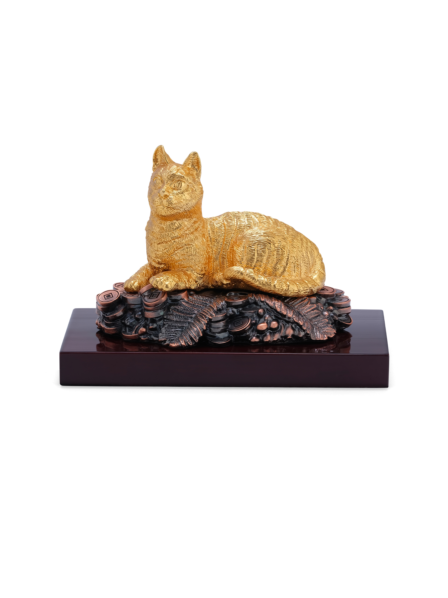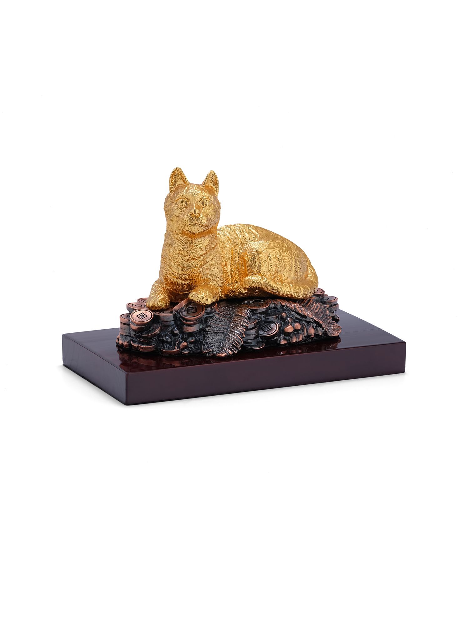 Trong phong thủy, mèo là linh vật đại diện cho sự kiên trì, mang đến may mắn và phú quý. Tượng Mèo Tài Lộc kết hợp tinh hoa nghệ thuật điêu khắc với giá trị văn hóa truyền thống, tạo nên một tác phẩm độc đáo và ý nghĩa. Thiết kế: Hình ảnh chú mèo nằm trên quan tiền và hạt dẻ – những biểu tượng của sự tốt lành, dư dả và thịnh vượng. Xen kẽ là các họa tiết lá cau, một biểu tượng văn hóa đặc trưng của Việt Nam, được chế tác tỉ mỉ, tạo nét độc đáo và giá trị nghệ thuật cao. Ý nghĩa: Tượng Mèo Tài Lộc mang thông điệp về sự giàu sang, phú quý và một cuộc sống đủ đầy, thịnh vượng. Đây cũng là lời cầu chúc cho sự may mắn và thành công, đặc biệt phù hợp với những ai đang tìm kiếm sự thịnh vượng trong công việc và cuộc sống. Chất liệu: Mạ vàng 24K Thụy Sĩ cao cấp, đảm bảo sự sang trọng và bền bỉ. Chế tác hoàn toàn thủ công, tinh xảo trong từng chi tiết. Kích thước: 14cm (Dài) x 7.5cm (Rộng) x 9cm (Cao). Sự lựa chọn hoàn hảo: Tượng Mèo Tài Lộc là món quà lý tưởng cho các dịp đặc biệt như tân gia, năm mới, khai trương, hoặc quà tặng tri ân đối tác, khách hàng. Đây không chỉ là một tác phẩm nghệ thuật mà còn mang ý nghĩa phong thủy sâu sắc, giúp người sở hữu đạt được thành công và hạnh phúc trọn vẹn.