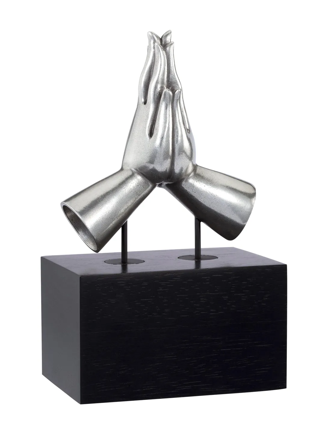Tượng Namaskara là biểu tượng của sự chào hỏi, sự tôn thờ và sự cầu khấn. Khi lòng bàn tay hướng vào trái tim, đó là biểu tượng của sự kính trọng và lời khẩn cầu. Tượng được làm bằng pewter cao cấp và được đặt trên đễ gỗ Nyatoh màu đen.