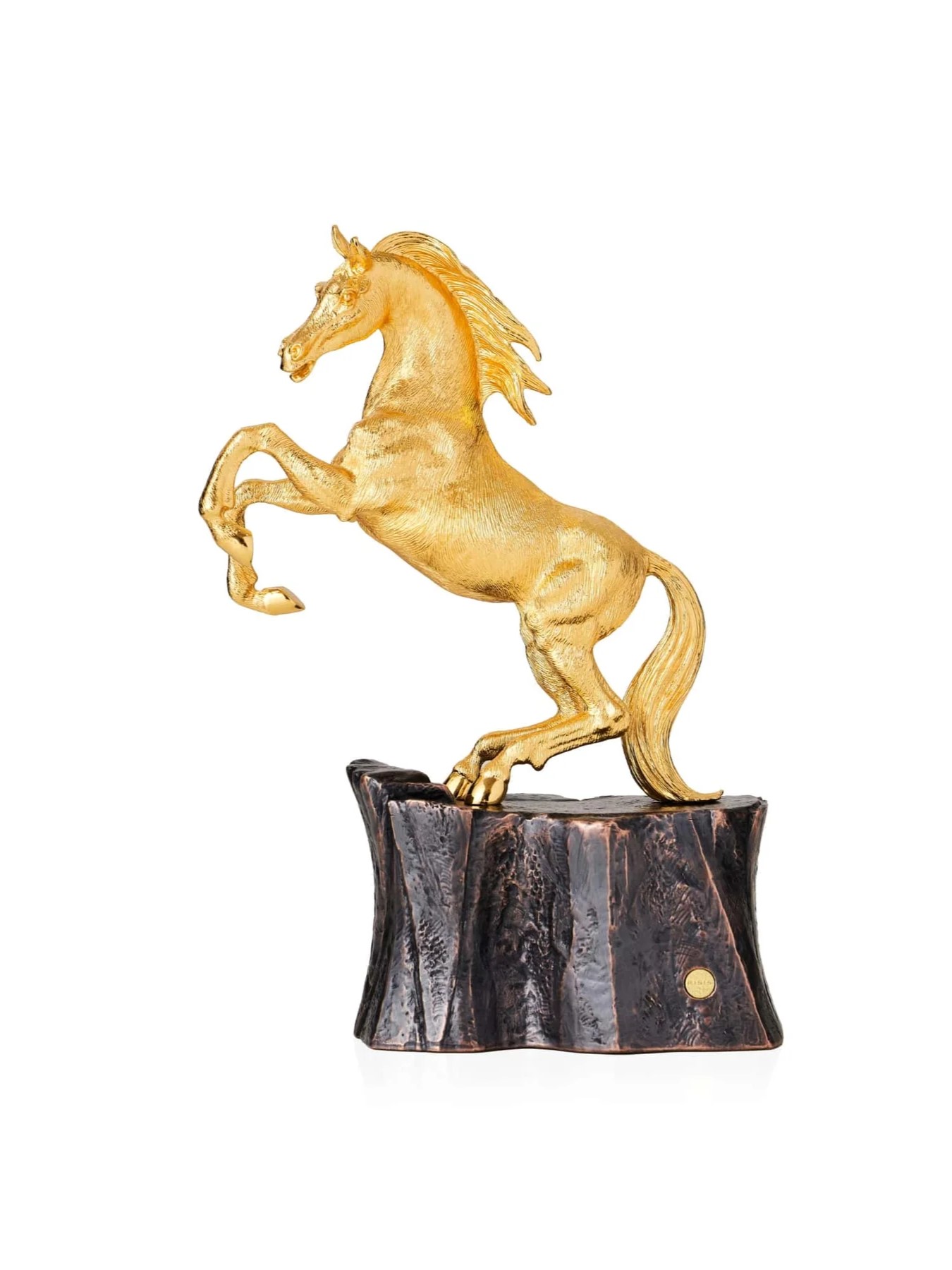 Ngựa Chiến Thắng III tái hiện khoảnh khắc huy hoàng của sự bứt phá và dẫn đầu. Hình tượng chú ngựa tung vó mạnh mẽ như ghi lại thời khắc chiến thắng – một biểu tượng của nghị lực, bản lĩnh và ý chí không lùi bước. Tác phẩm được chế tác từ pewter cao cấp, phủ vàng Thụy Sĩ 24K, giúp từng đường cong cơ bắp, từng sợi bờm tung bay đều toát lên thần thái oai phong. Phần đế pewter mạ đồng đen tạo nên sự tương phản tinh tế, làm tăng chiều sâu của tổng thể. Với thiết kế hài hòa giữa nghệ thuật và phong thủy, Ngựa Chiến Thắng III mang ý nghĩa chinh phục, thành công và vươn lên đỉnh cao. Đây là món quà lý tưởng dành cho những cột mốc quan trọng, lời chúc thăng tiến hay sự khởi đầu đầy khí thế. Chất liệu: Tượng ngựa: Pewter mạ đồng đen Lớp phủ hoàn thiện: Mạ vàng Thụy Sĩ 24K Đế: Pewter mạ màu đồng đen Thông số: Kích thước: Dài 230 x Rộng 110 x Cao 330 mm Trọng lượng sản phẩm: 0.43 kg Trọng lượng cả hộp: 3.50kg